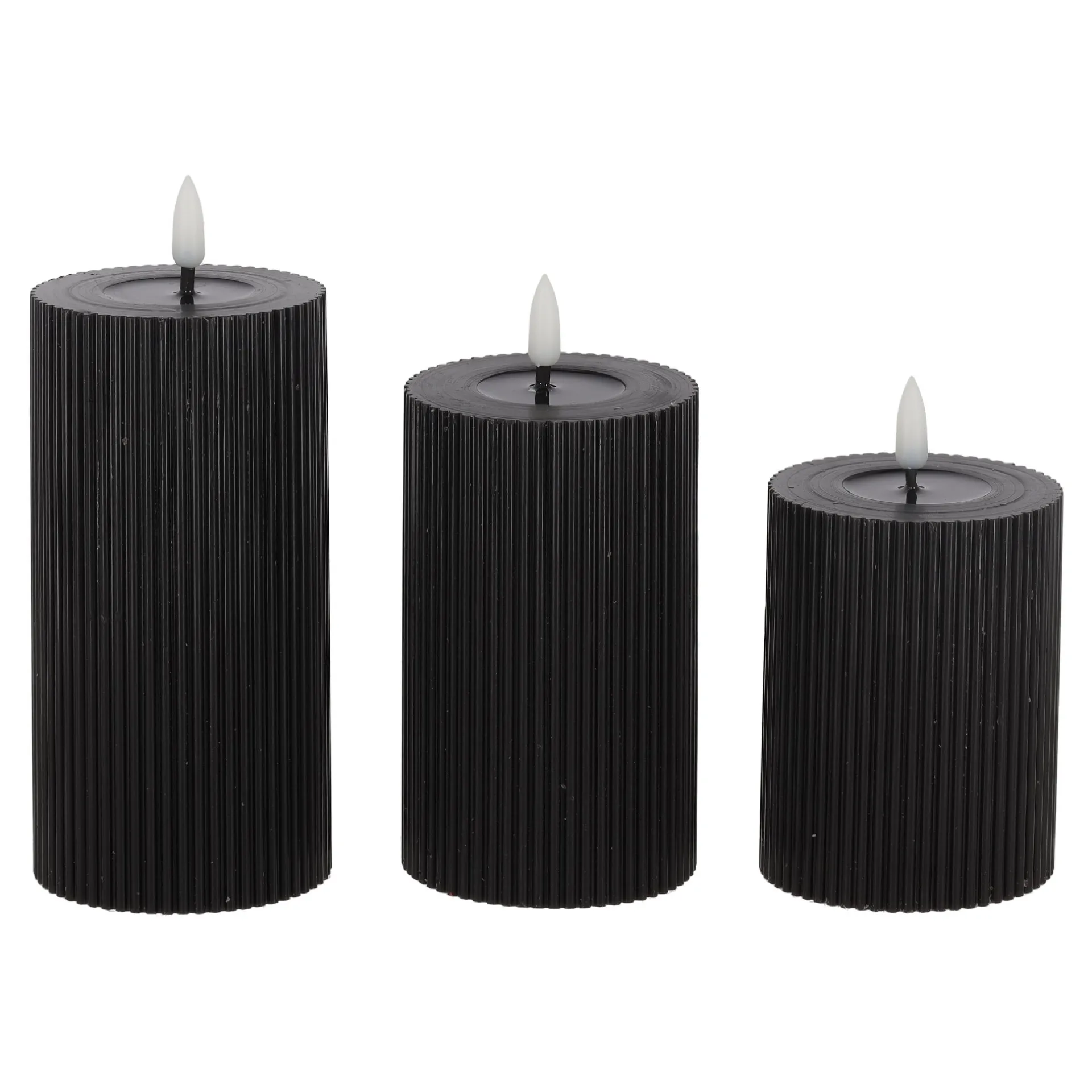 Set van drie LED-kaarsen met ribbelstructuur en ‘melted’ effect. Inclusief afstandsbediening voor eenvoudig gebruik en een warme, sfeervolle gloed.