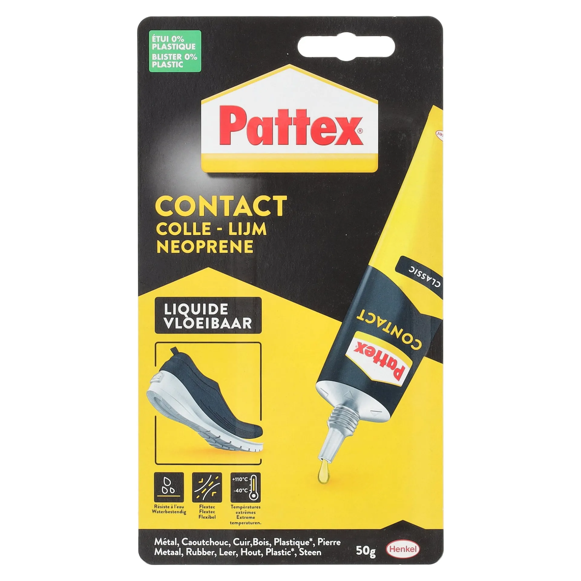 Pattex Contactlijm vloeibaar 50 g is ideaal voor kleine reparaties aan diverse materialen zoals metaal, hout en plastic. De snelle, sterke hechting is gemakkelijk te gebruiken.