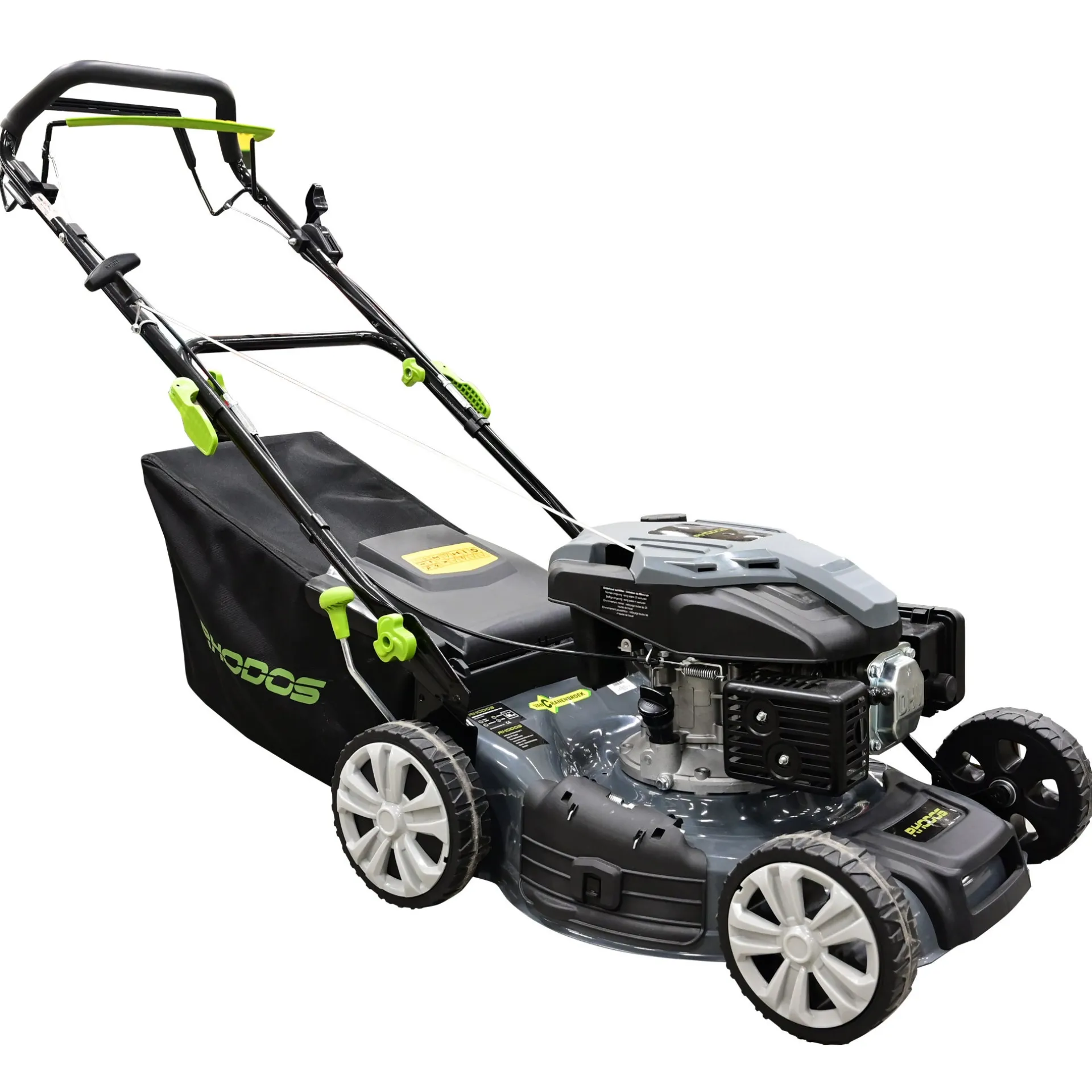 De Rhodos benzinegrasmaaier heeft een maaibreedte van 46 cm en is uitgerust met aangedreven achterwielen voor extra gebruiksgemak. Deze 3-in-1 maaier biedt de keuze tussen mulchen, grasopvang en zijuitworp, waardoor hij geschikt is voor verschillende gazontypes.