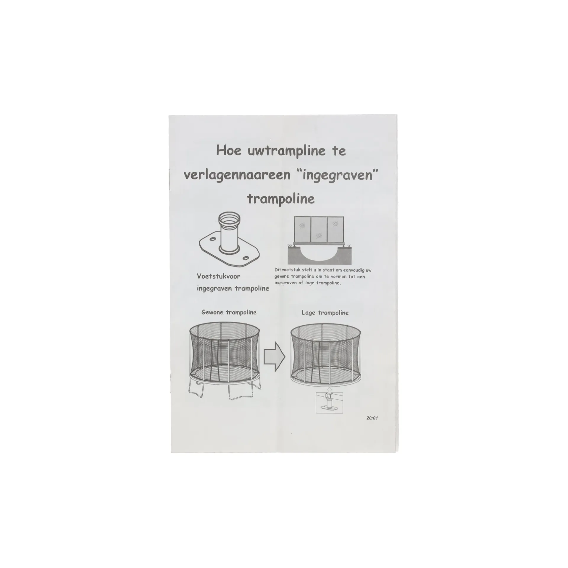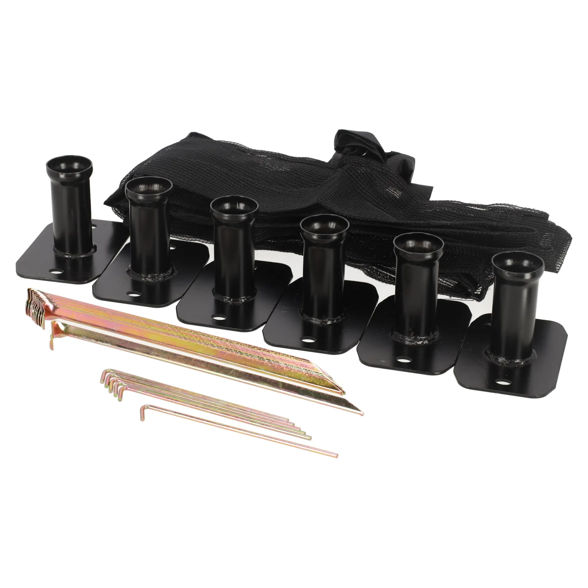 Trampoline inbouwkit met losse poten en stevige grondpinnen, ontworpen om trampoline veilig en netjes in de grond af te werken.