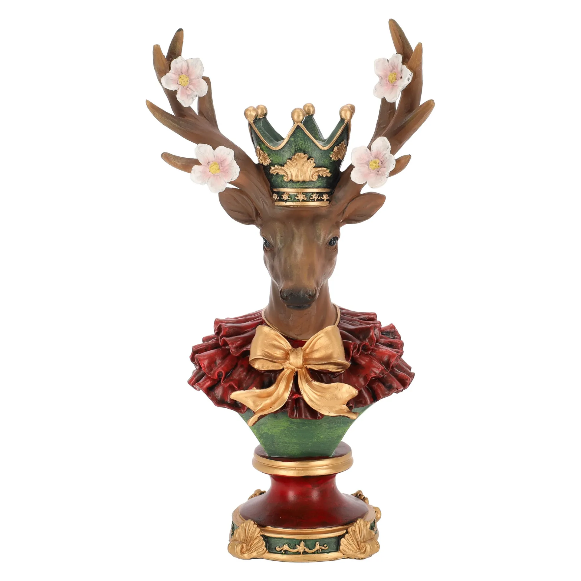 Breng een vleugje koninklijke kerstsfeer in huis met dit decoratieve beeld van een rendier met kroon. Het beeld is gedetailleerd afgewerkt in warme tinten groen, rood en goud, met bloesems op het gewei en een grote strik rond de hals. Een opvallende blikvanger voor op de schouw, dressoir of vensterbank tijdens de feestdagen.