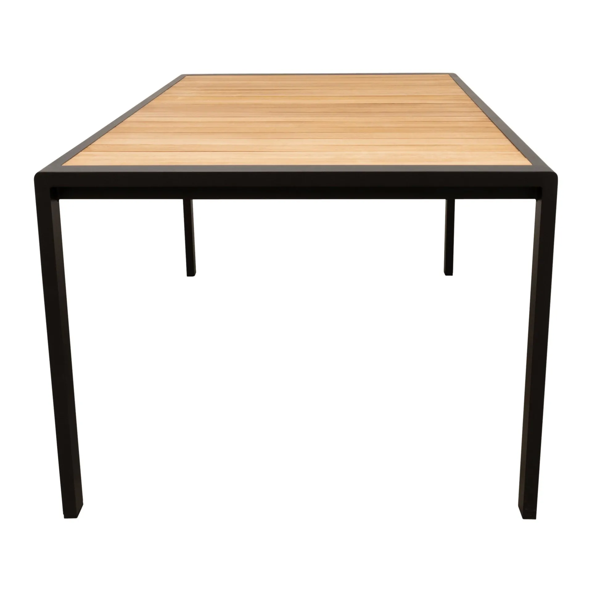 Deze tafel is compact en modern, ideaal voor kleine ruimtes, zowel binnen als buiten. Het aluminium frame kan niet roesten en zorgt samen met het teak tafelblad voor stabiliteit en duurzaamheid. De zwarte kleur geeft de tafel een eigentijdse uitstraling, terwijl de hoogwaardige materialen garant staan voor jarenlang gebruik.
