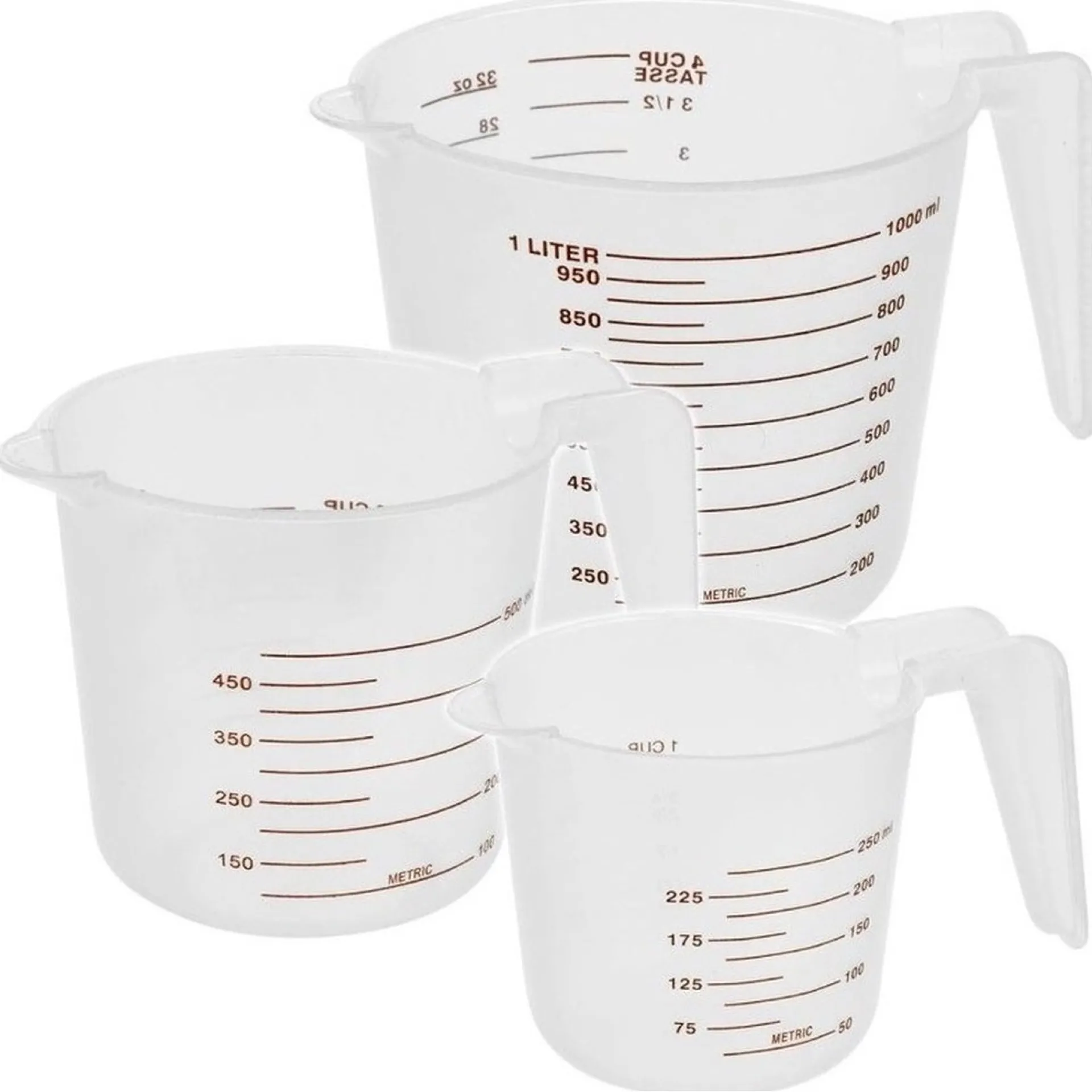 Drie verschillende kunststof maatbekers in drie verschillende maten. 250 milliliter, 500 milliliter en 1000 milliliter. Op de bekers staan de maten aangegeven.