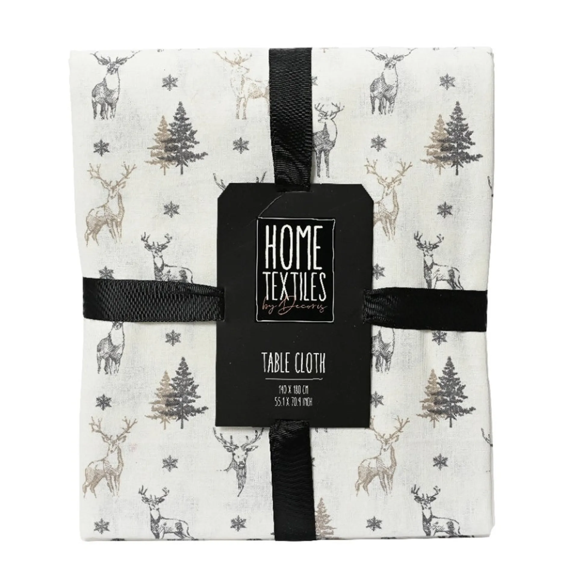 Tafelkleed van Decoris met een sfeervol winterdesign van rendieren, dennenbomen en sneeuwvlokken. De zachte tinten geven de tafel een warme en natuurlijke uitstraling voor de feestdagen.