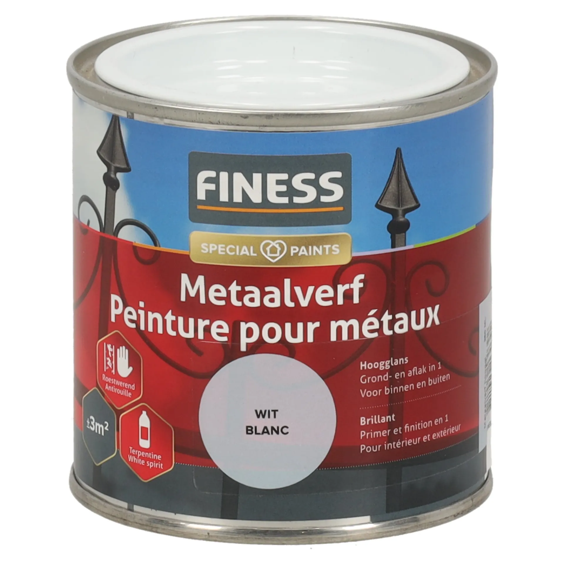 Productnaam:Metaalverf hoogglans wit 9010 250ml Finess