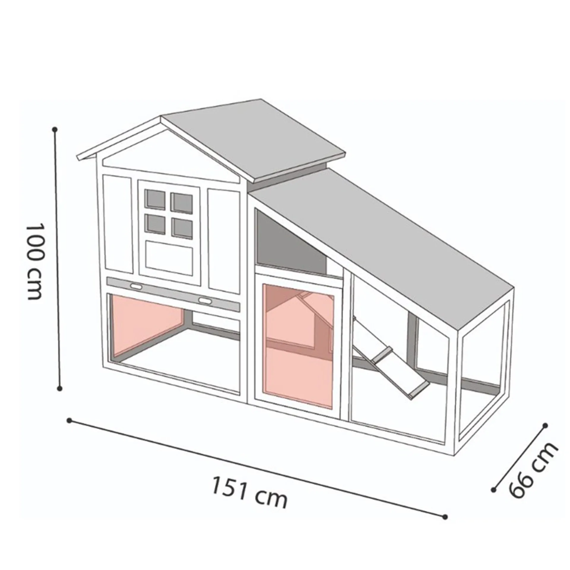 Dit konijnenhok met verdieping is geschikt voor een koppel of kleine konijnen. Het ruime nachthok heeft een uitschuifbare mestlade en een deurtje aan de voorkant voor gemakkelijke toegang. Via een trap bereiken de dieren de ren met schuin dak, zodat ze ook bij regen droog zitten. Het nachthok kan eenvoudig van buitenaf worden afgesloten. De ren heeft een deurtje naar de tuin.