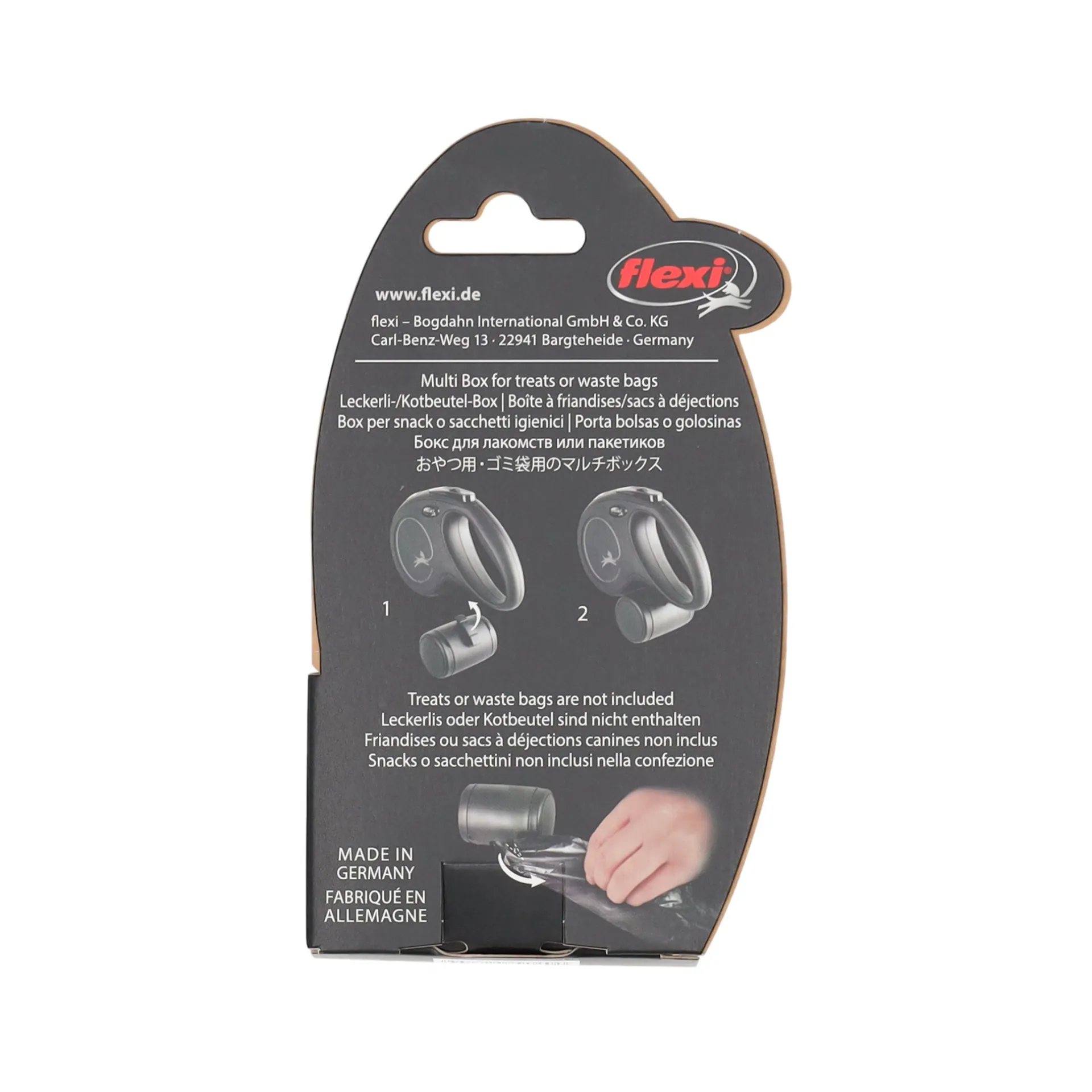 Bewaar snoepjes of poepzakjes in deze handige Multi Box die je aan de Flexi rollijn kunt bevestigen. Makkelijk te installeren en verkrijgbaar in 2 kleuren. Perfect voor onderweg!