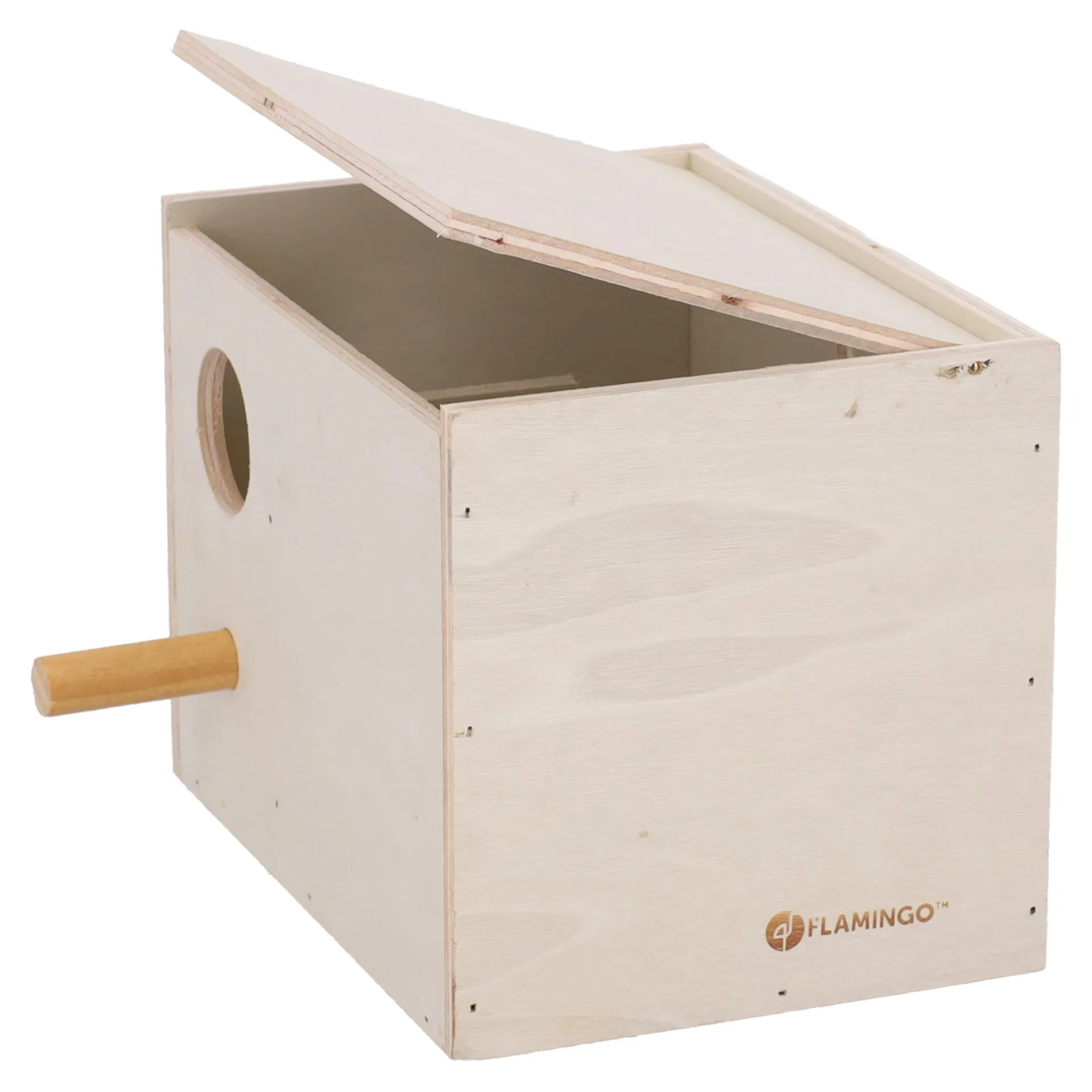 Geef jouw parkieten een gezellig thuis met dit houten vogelhuisje! Het kastje is eenvoudig schoon te maken dankzij het openklapbare dak en kan gemakkelijk aan de muur worden bevestigd. De invliegopening van 40 mm zit aan de linkerkant en heeft een invliegstokje van 50 x 14 mm. Een scheidingswand en uitholling in de bodem zorgen voor extra nestcomfort. Perfect voor parkieten en grasparkieten, en een geweldige toevoeging aan je voliĆØre of vogelverblijf.