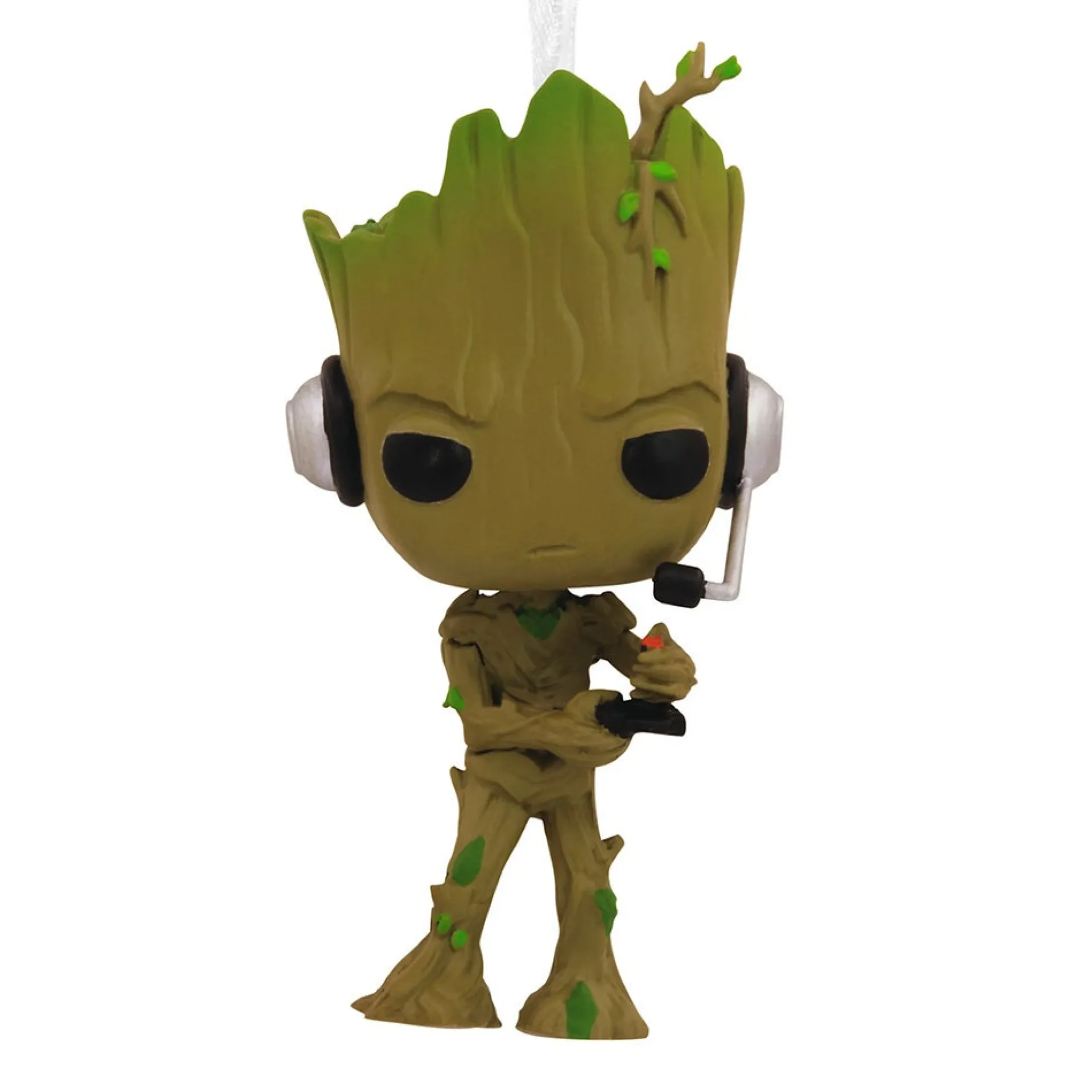 Stoer hangfiguurtje van Groot in Funko Pop-stijl, met koptelefoon, microfoon en bediening in zijn handen. Dankzij het smalle ophanglint hang je deze takkenheld eenvoudig aan een tak, haakje of kastdeurtje als speelse blikvanger in huis of tussen je feestversiering.