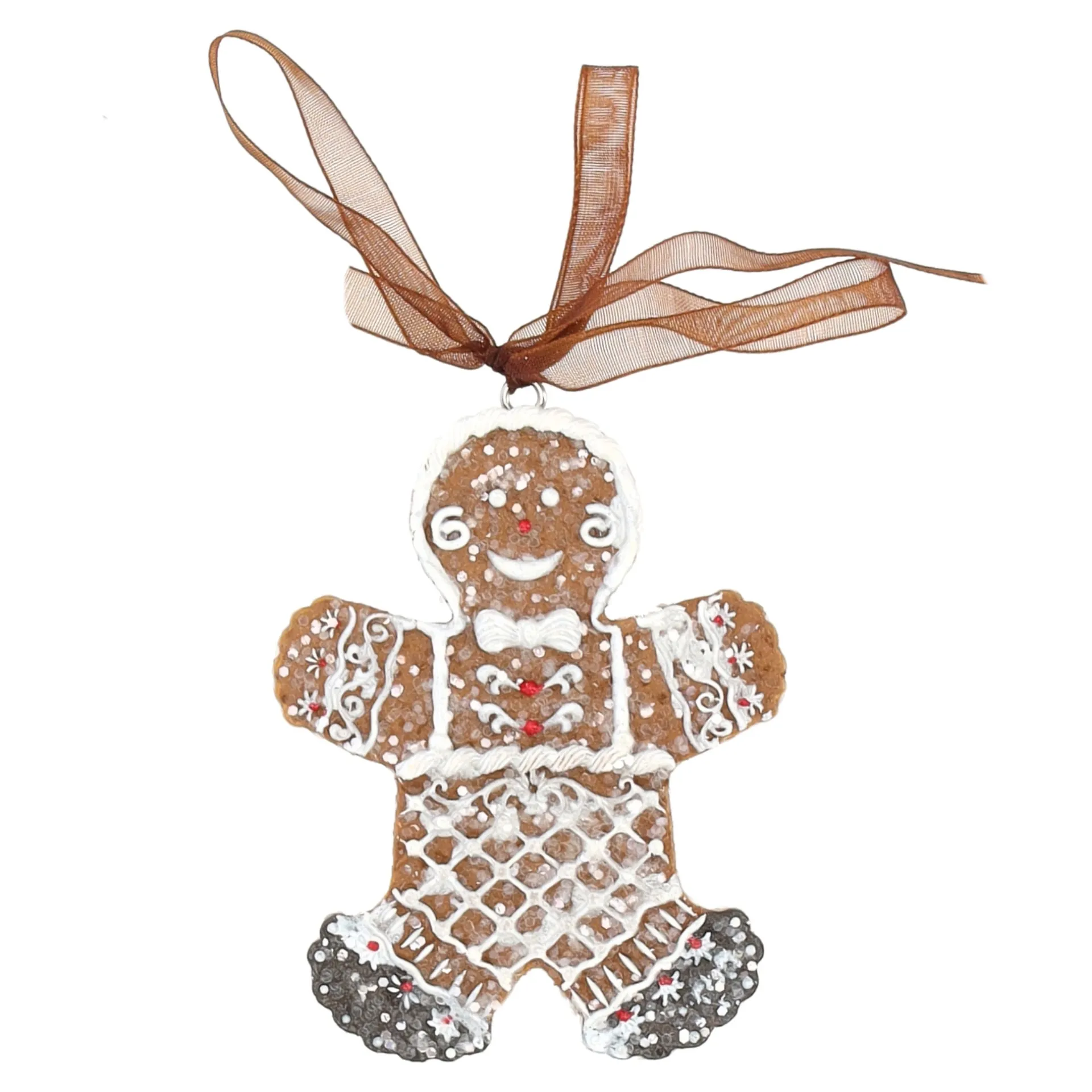 Vrolijke metalen kersthanger in de vorm van een gingerbread poppetje. Met zijn witte details en bruin lint brengt hij een speelse en feestelijke sfeer in de kerstboom.