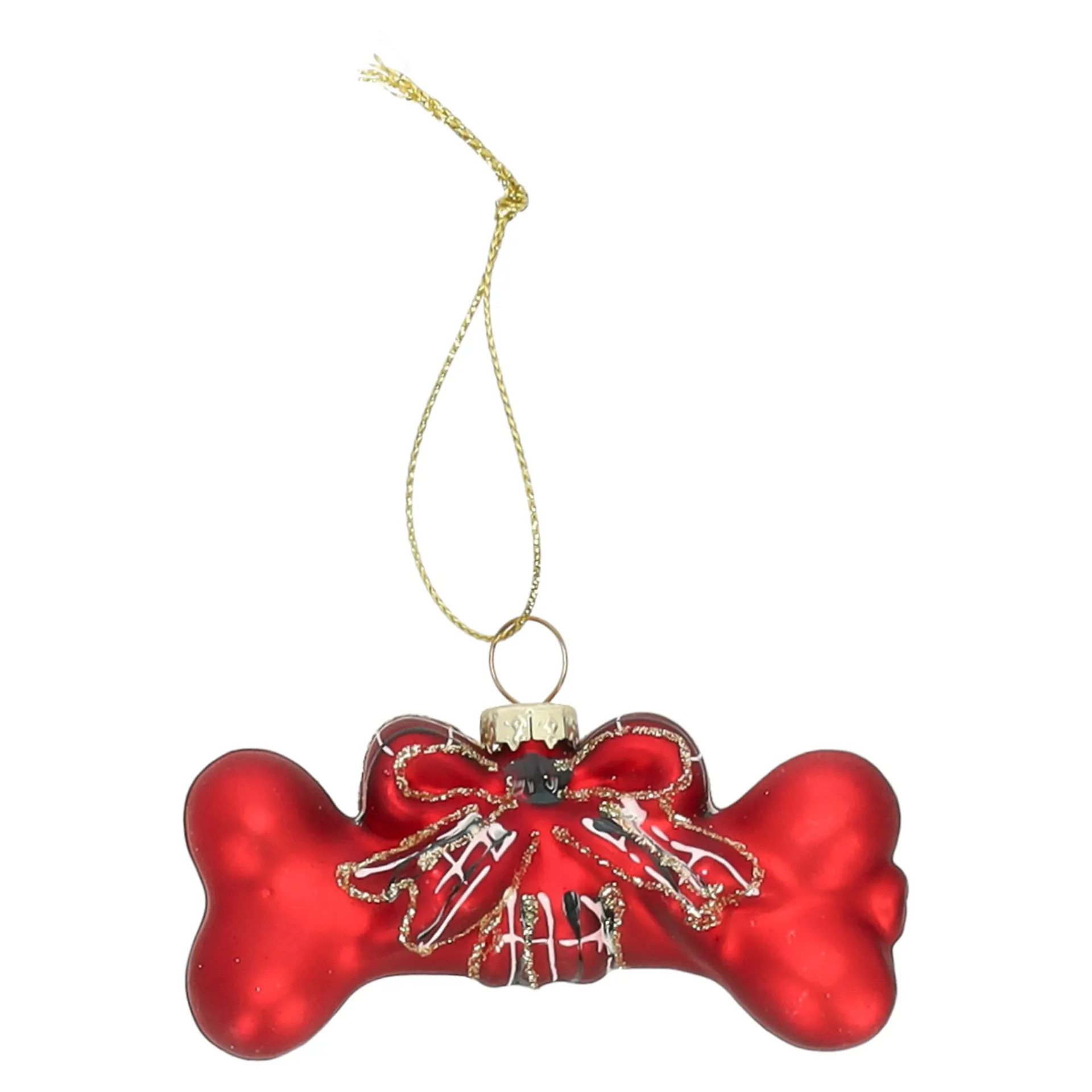 Deze glazen hanger in de vorm van een rood hondenbot is een leuke toevoeging voor dierenliefhebbers. Het bot is versierd met een feestelijke strik met gouden accenten, waardoor hij mooi opvalt in de kerstboom. Met het goudkleurige koordje hang je hem makkelijk tussen de andere kerstdecoratie.
