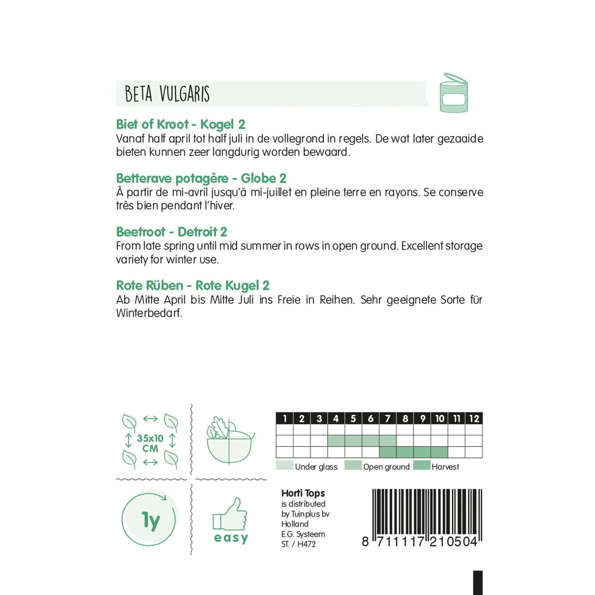 Vanaf half april tot half juli in de vollegrond in regels. De wat later gezaaide bieten kunnen zeer langdurig worden bewaard.