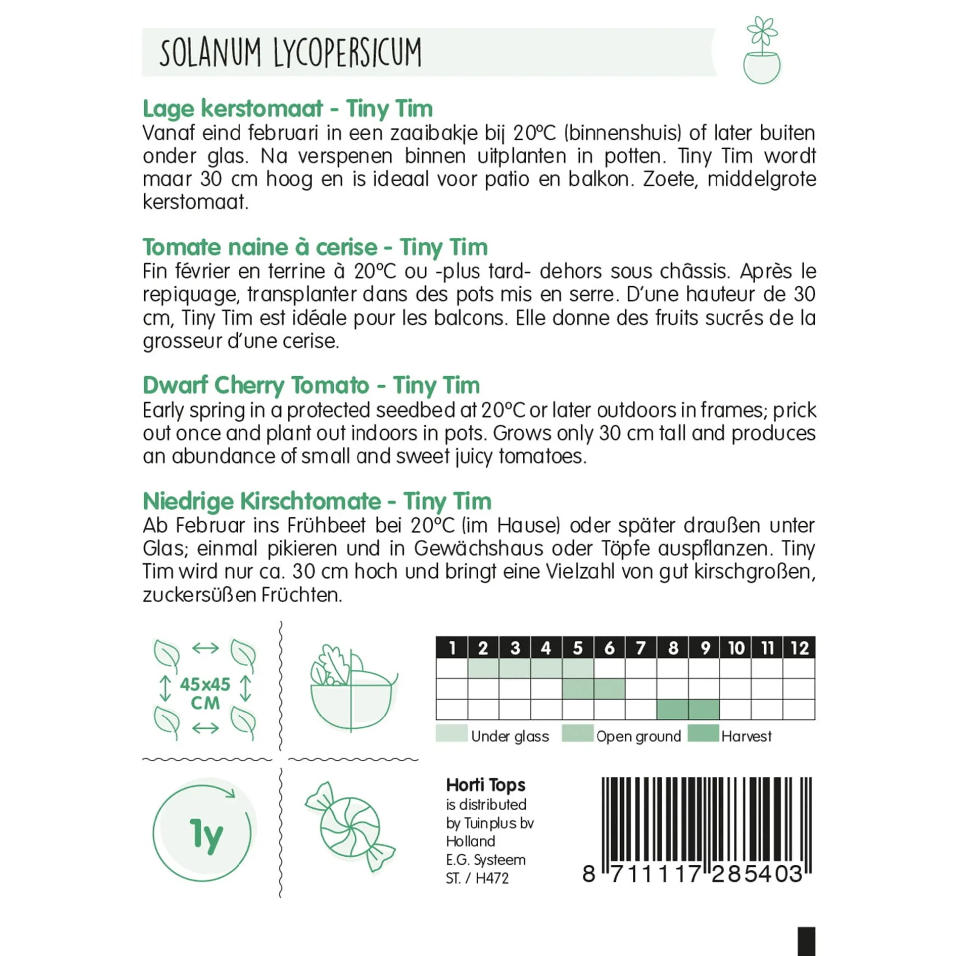 Tomaten Tiny Tim is een compact kerstomatenras dat slechts 30cm hoog wordt, ideaal voor teelt in potten op het terras of balkon. Geschikt voor zowel kas- als vollegrondsteelt, met zoete tomaatjes die heerlijk zijn in salades, bij de barbecue of als borrelhapje.