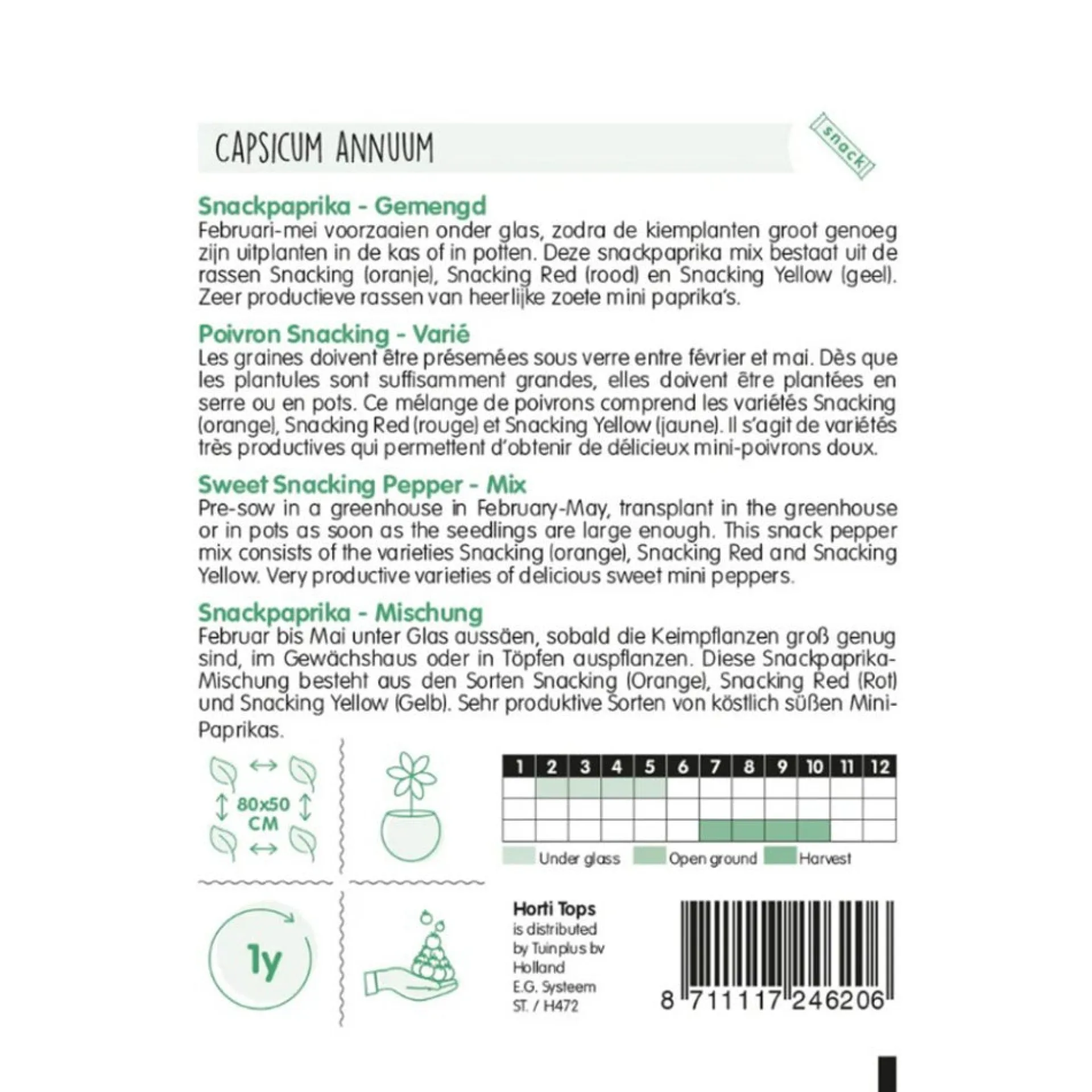 Deze snackpaprika mix bestaat uit de rassen Snacking (oranje), Snacking Red (rood) en Snacking Yellow (geel). Zeer productieve rassen van heerlijke zoete mini paprika’s.