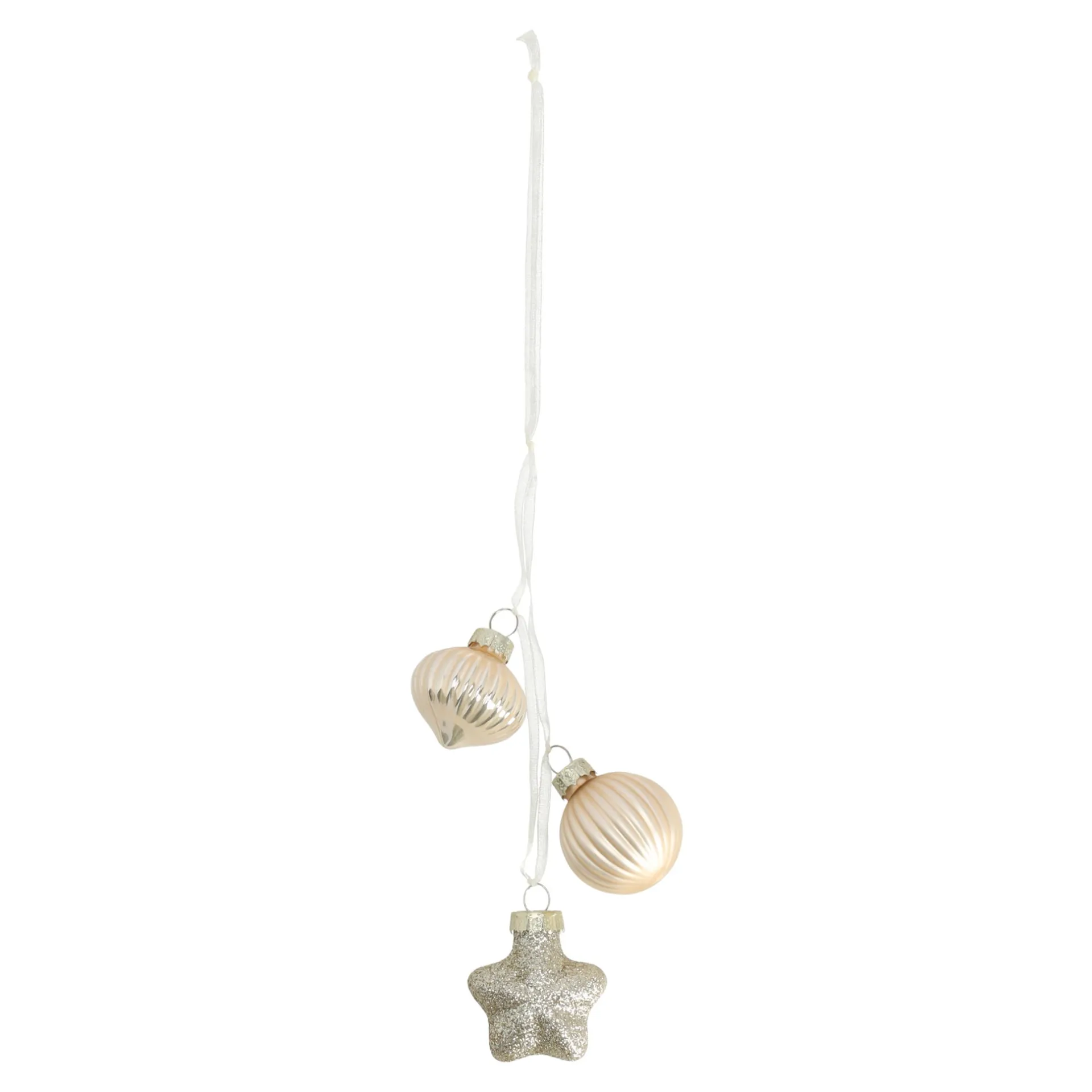 Een decoratieve set van drie kerstballen in een parelmoerachtige (pearl) kleur met glanzende afwerking. De ballen vormen samen een trosje en zijn perfect als elegante blikvanger in de kerstboom of feestdecoratie.
