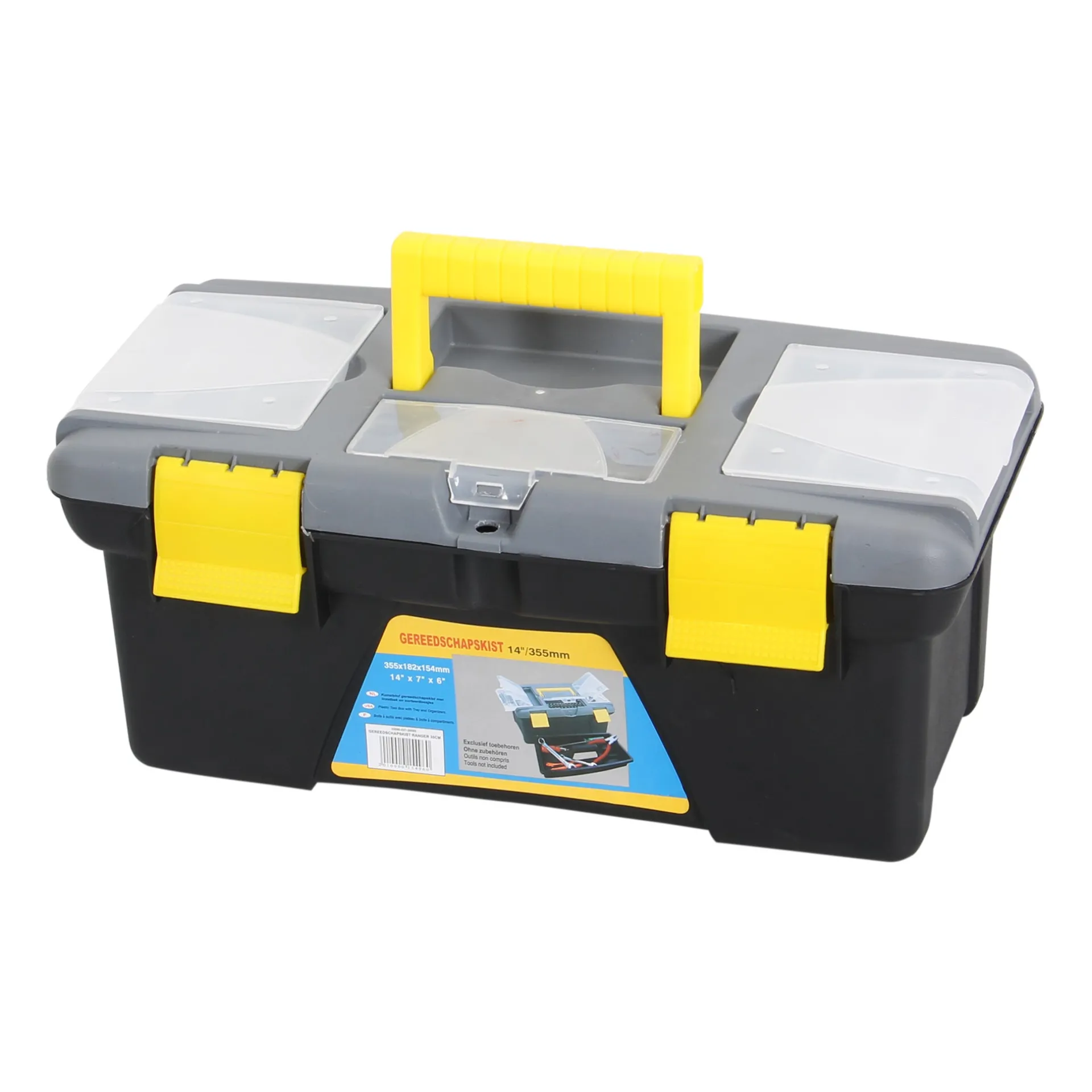 Een stevige en functionele gereedschapskist van 35 cm, ontworpen voor het handig opbergen en vervoeren van diverse gereedschappen en accessoires. Ideaal voor ambachtslieden, automonteurs, bouwvakkers en iedereen die waarde hecht aan orde en efficiëntie in hun werk.