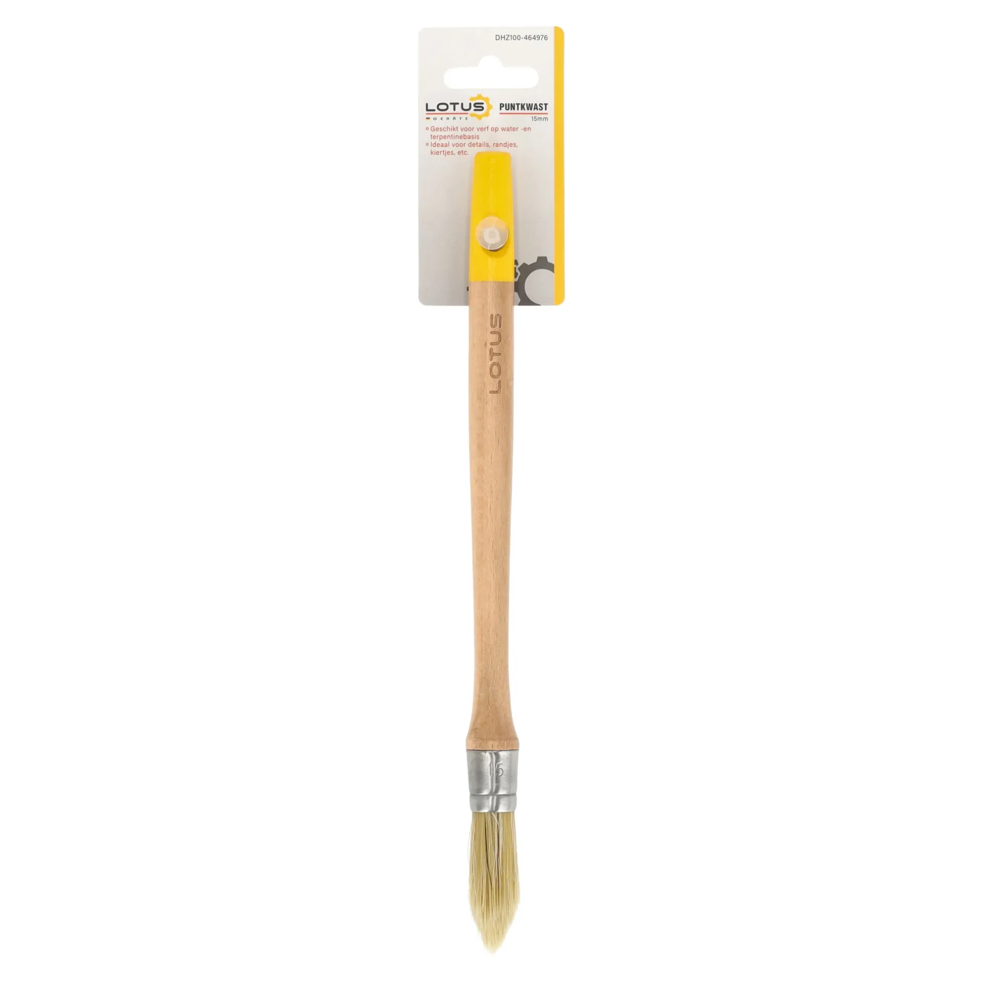 Puntkwast van Lotus met een breedte van 15 mm. Deze universele kwast is geschikt voor precies schilderwerk langs randen, in hoeken en bij detailklussen. De lange houten steel biedt een fijne grip en goede controle.