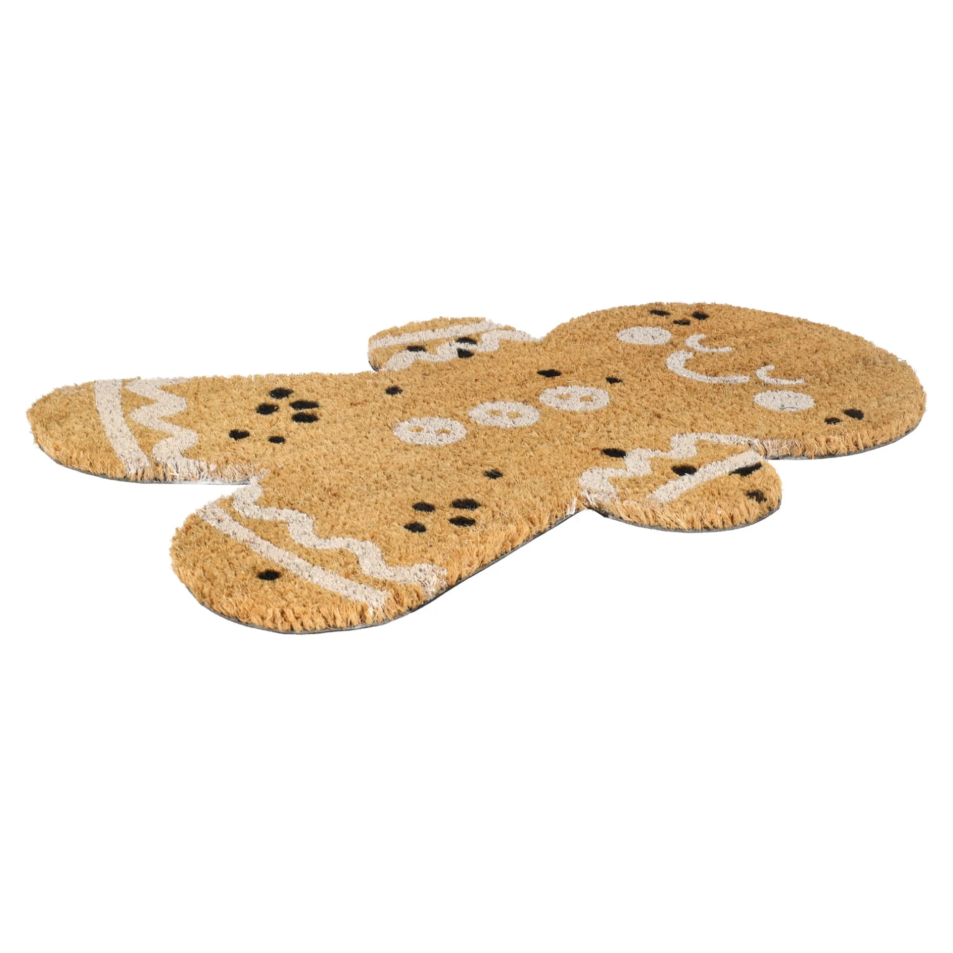 Kokos deurmat in de vorm van een vrolijke gingerbread man, versierd met witte en zwarte details voor een speelse kerstsfeer bij de deur.