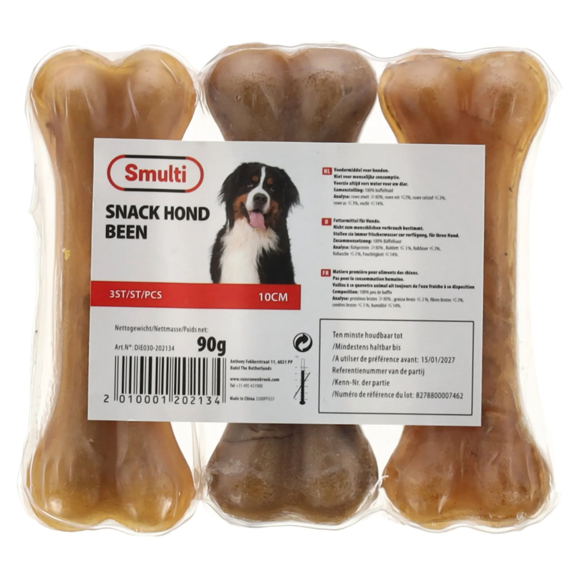 De snack hond been is een stevige en natuurlijke kauwsnack voor honden, gemaakt van hoogwaardig botmateriaal. Deze kauwsnack biedt langdurig kauwplezier en helpt bij het ondersteunen van de mondgezondheid door het reinigen van het gebit en het verminderen van tandplak en tandsteen. Het bot is een natuurlijke bron van eiwitten en mineralen, zonder kunstmatige toevoegingen, wat het een gezonde keuze maakt voor honden van alle rassen en leeftijden. Laat de hond niet alleen met kauwmateriaal. Zorg voor vers water.