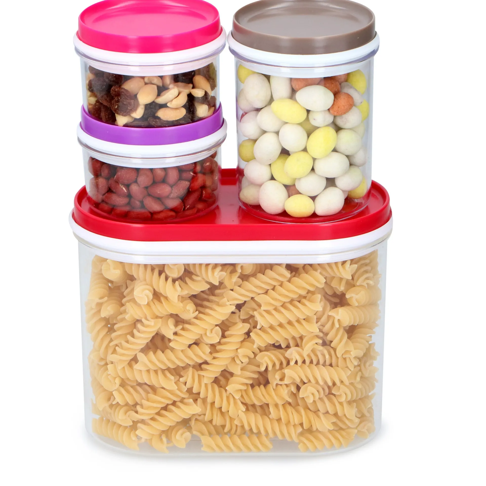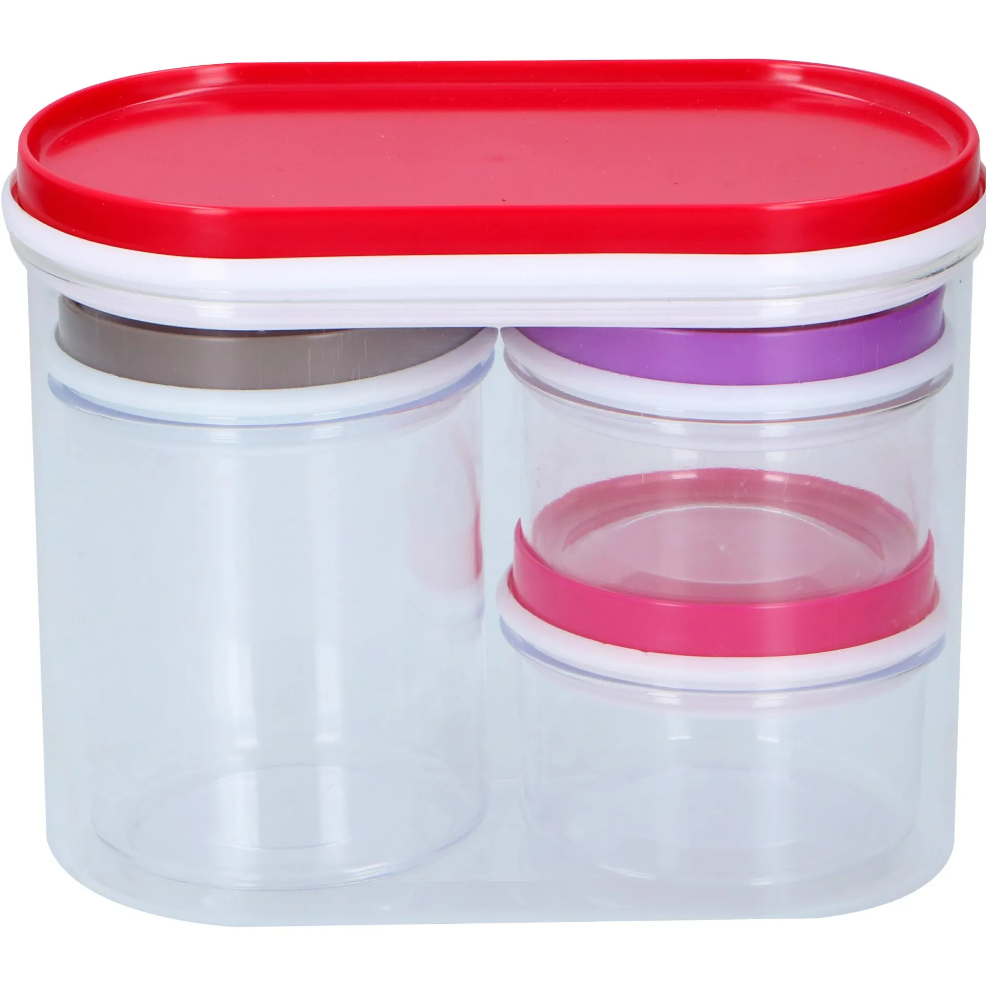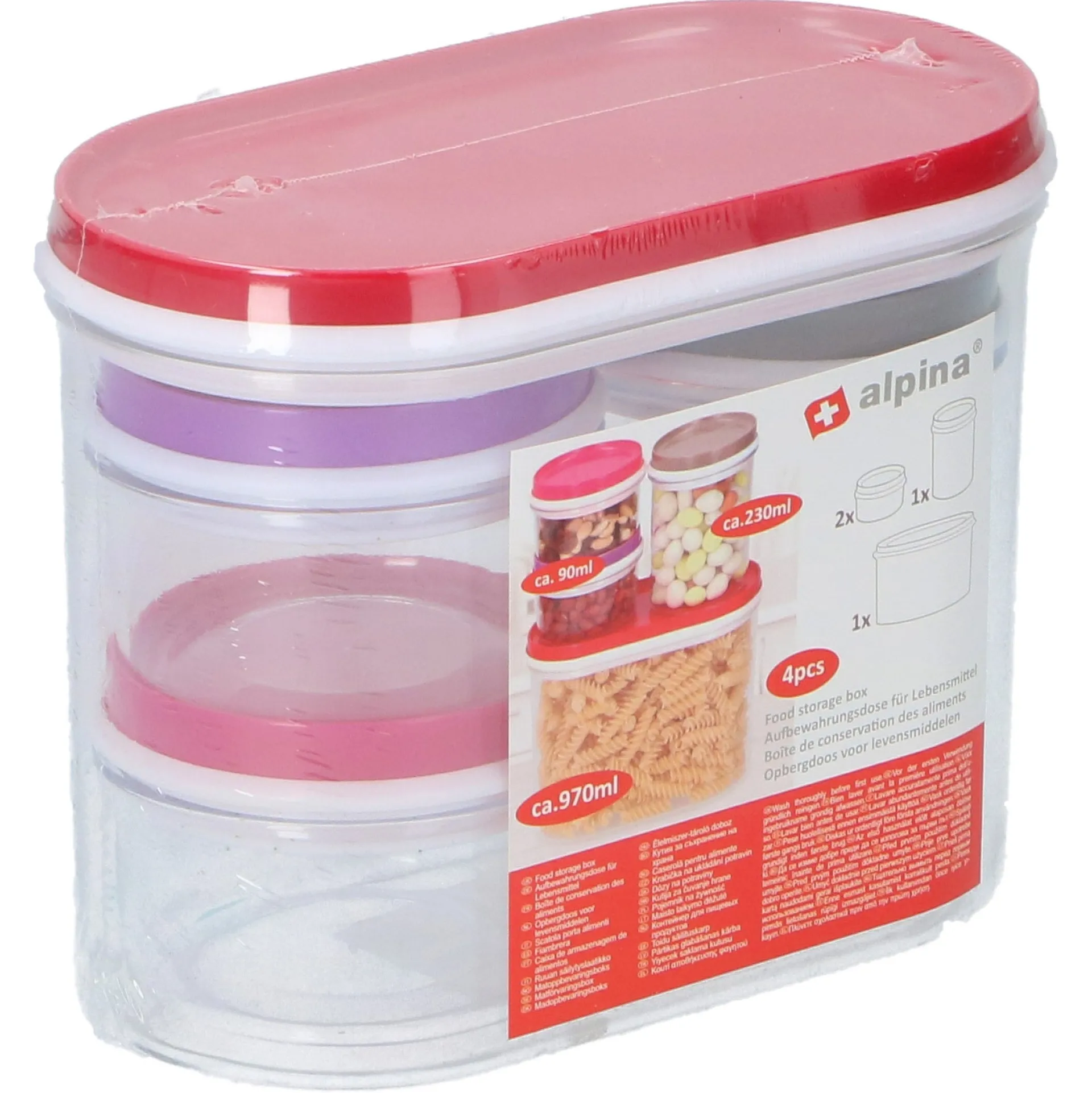 Set van vier Alpina opbergdozen voor het bewaren van voedsel. De set bestaat uit de volgende maten: 2x 90 ml, 1x 230 ml, 1x 970 ml.