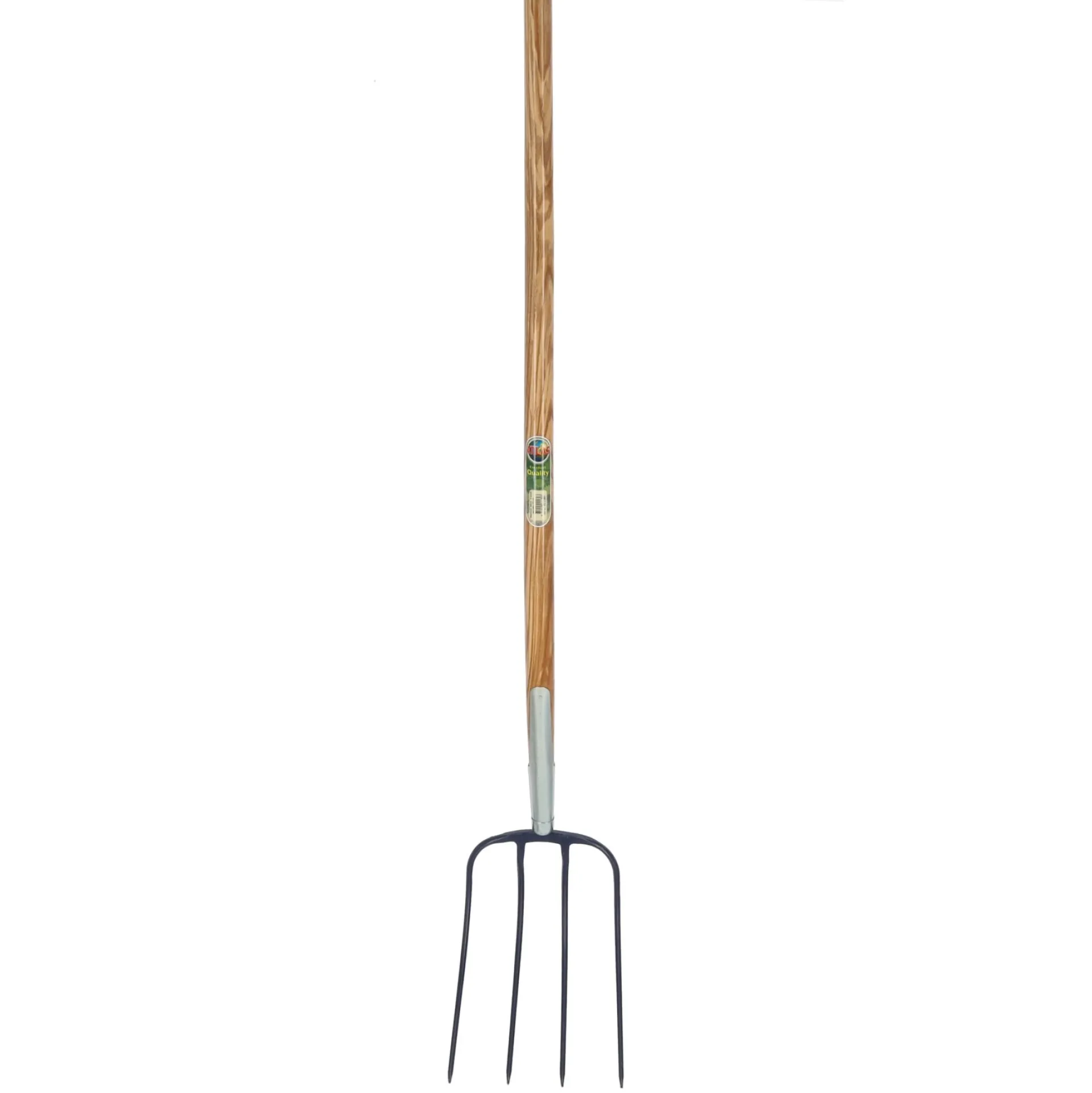 Een 4-tands mestvork (met een steel van 135 cm), stevig en duurzaam. Geschikt voor tuin- en landbouwtaken, met een ergonomisch ontwerp voor comfortabel gebruik.