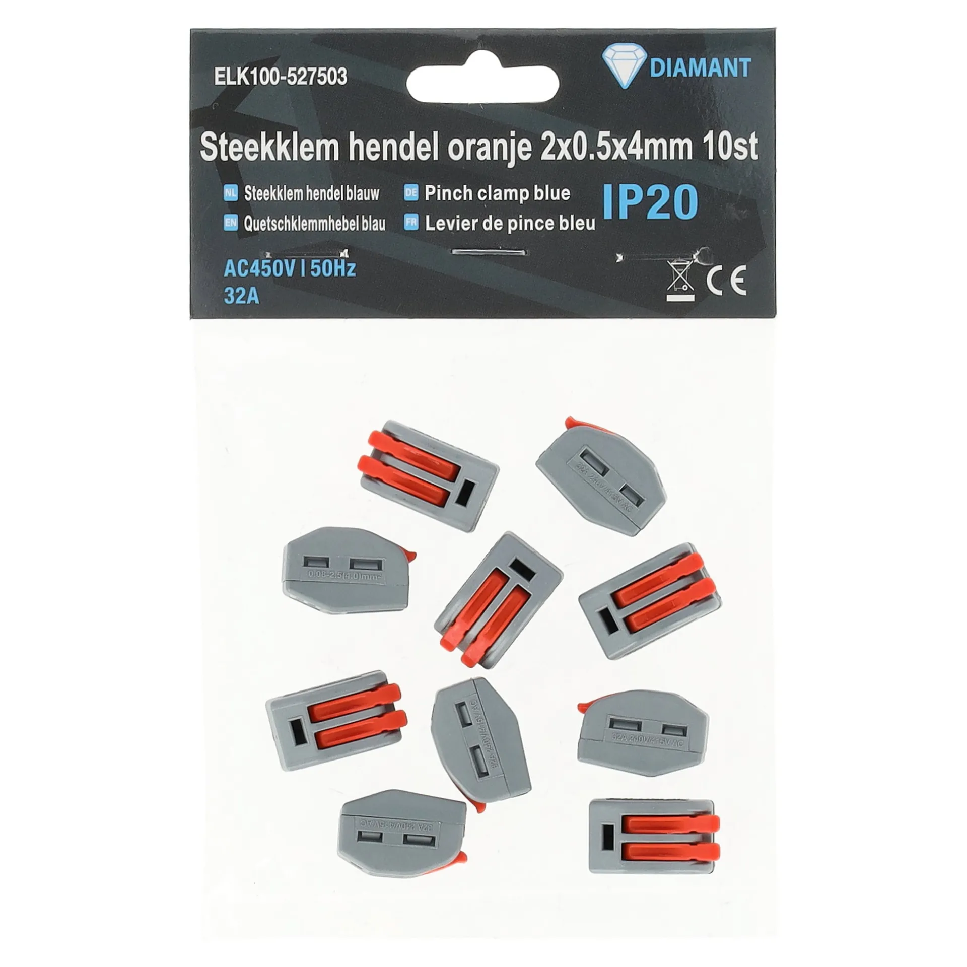 Deze Diamant steekklemmen met oranje hendel zijn geschikt voor het snel en veilig verbinden van twee elektrische draden van 0,5 tot 4 mm². Dankzij de hendelverbinding zijn de draden eenvoudig vast en los te maken zonder gereedschap. Alleen geschikt voor binnentoepassing (IP20).