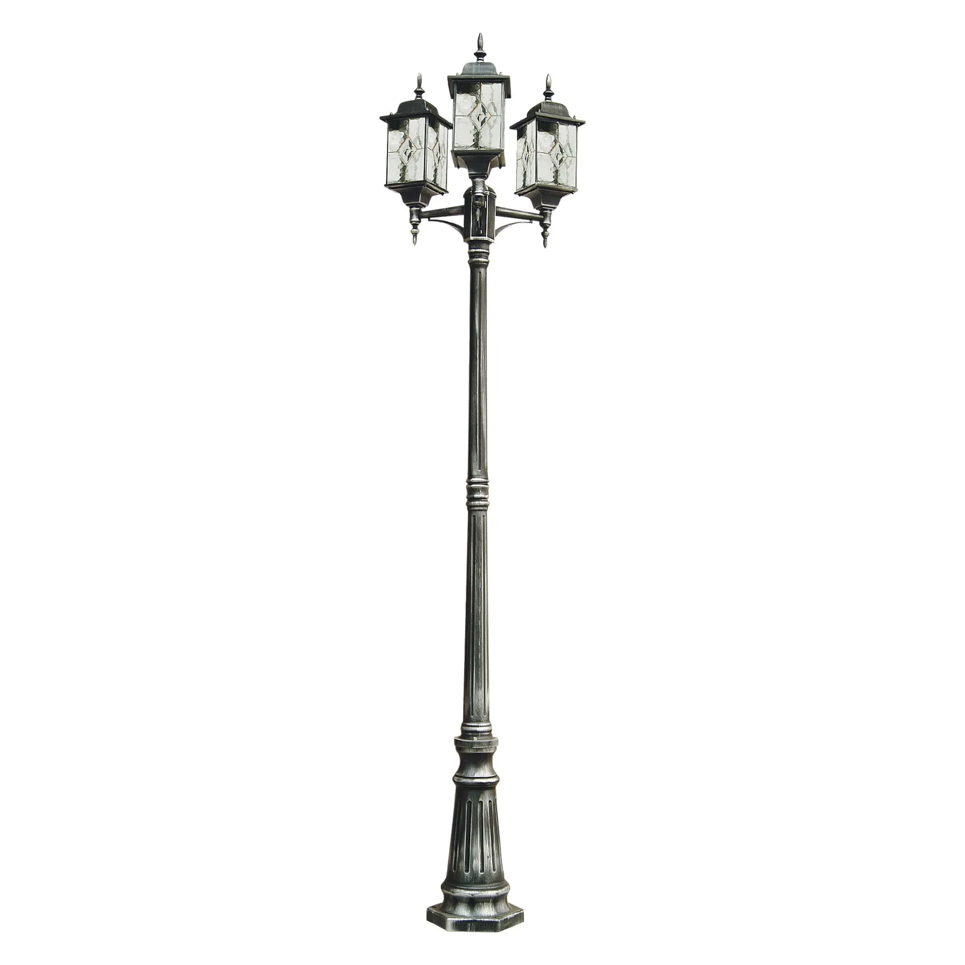 Tuinpaallamp met drie lampen, ontworpen om stijlvolle en functionele verlichting te bieden voor patio’s, terrassen en paden. Hoogte: 228 cm.