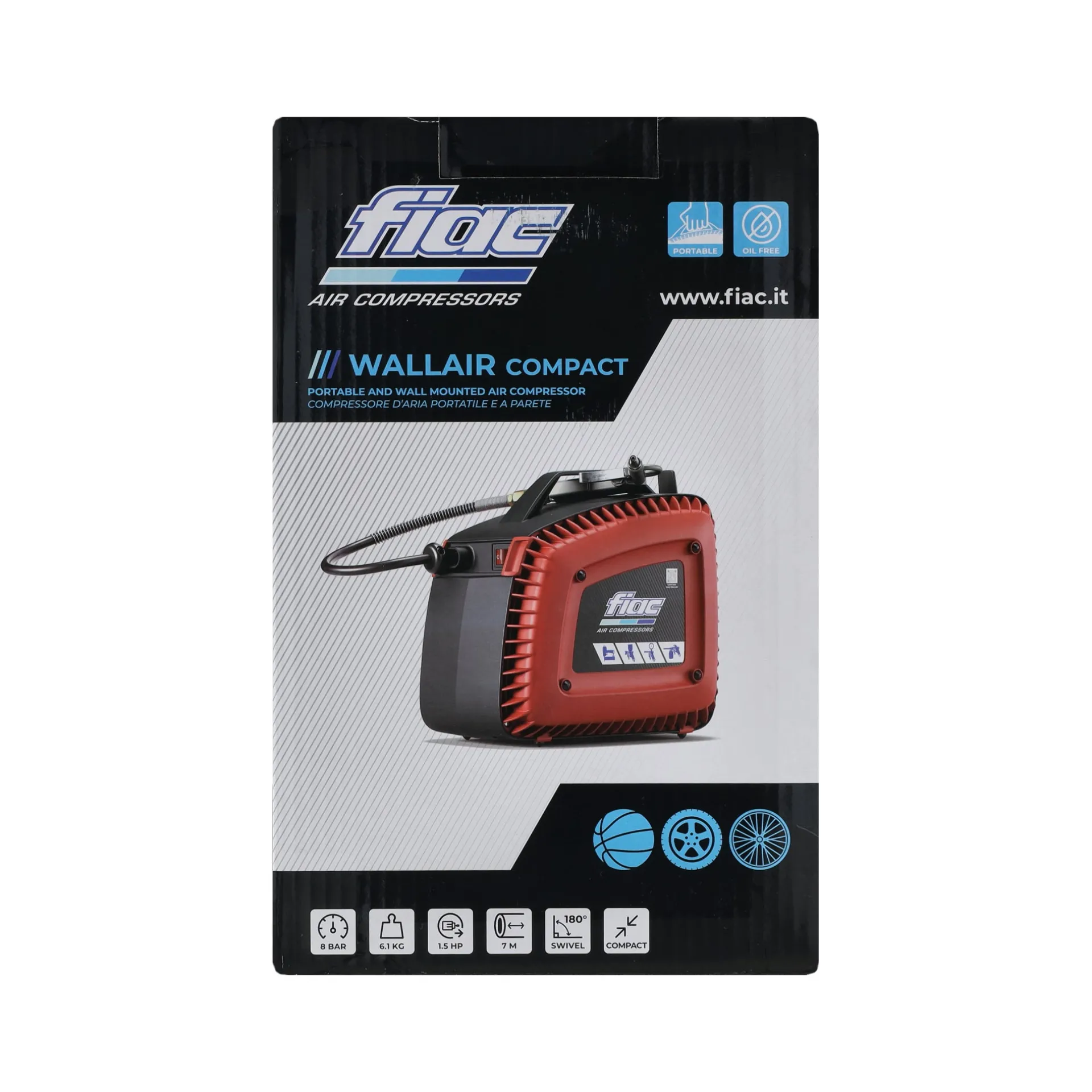 Een compact en krachtig luchtgereedschap. Deze compressor kenmerkt zich doordat deze aan de muur kan worden gemonteerd. Voorzien van een automatische slanghaspel met een lengte van 7 meter, wat zorgt voor gemak en orde op de werkplek. Ideaal voor zowel huishoudelijk als professioneel gebruik, zoals het oppompen van banden.