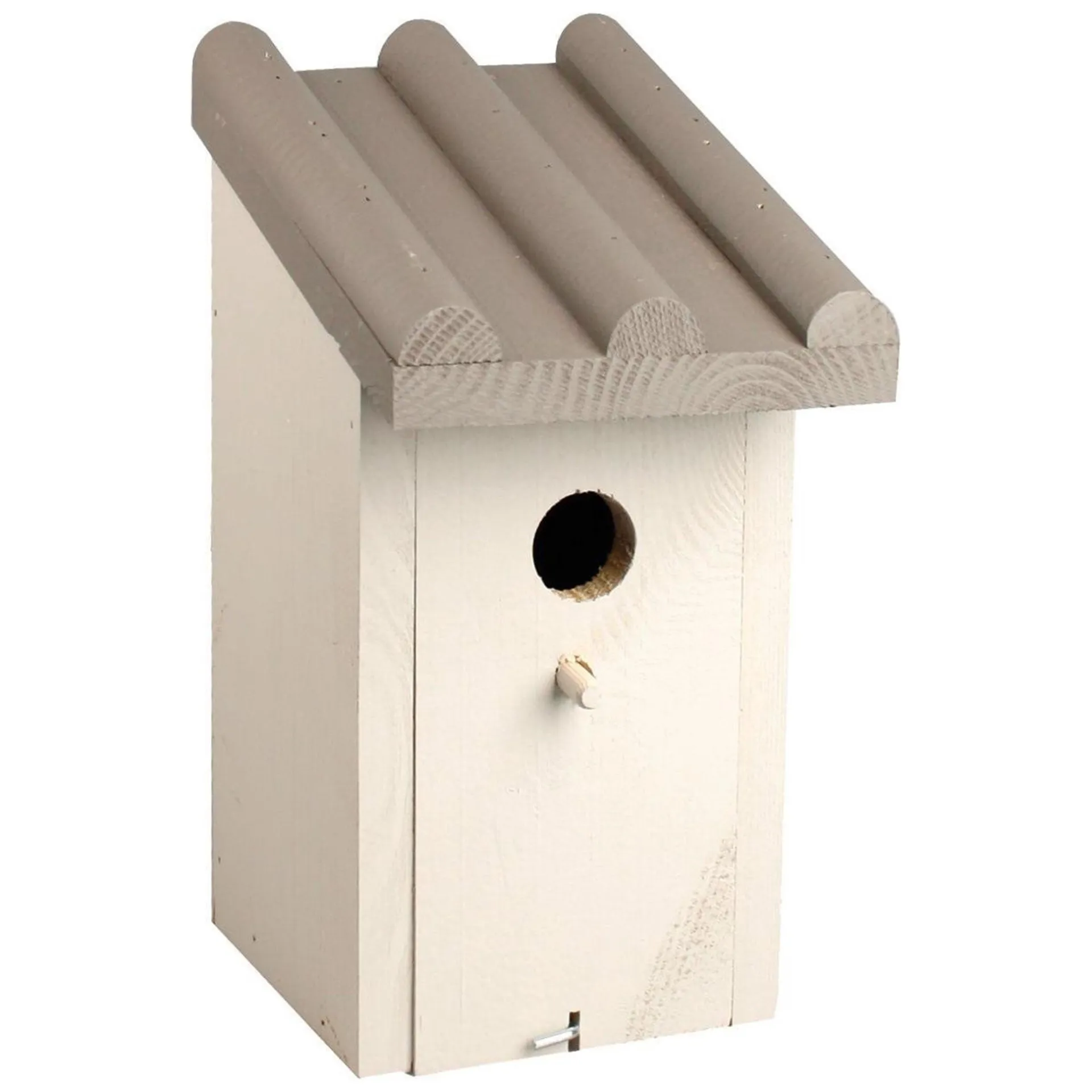 Houten vogelhuis in beige kleur met grijs golfdak. Voorzien van invliegopening en zitstokje, geschikt voor kleine tuinvogels.