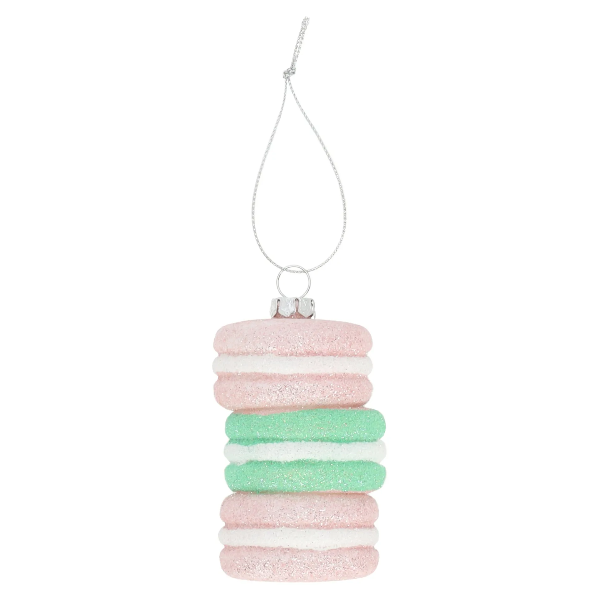 Deze hanger in de vorm van een stapel macarons geeft je boom een zoete, pastelachtige uitstraling. De roze en groene macarons zijn afgewerkt met glitters, waardoor het ornament leuk opvalt tussen de takken.