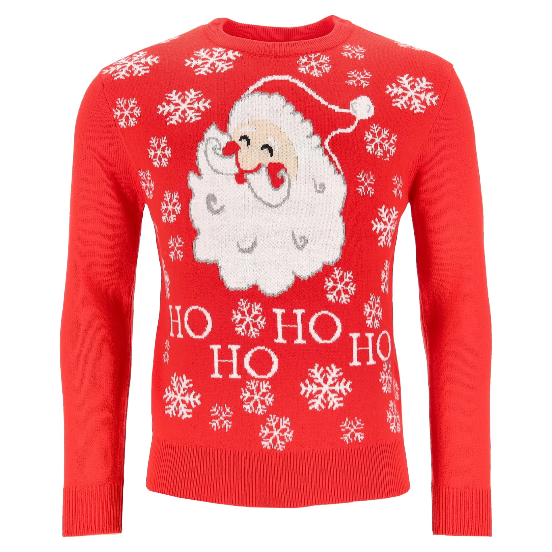 Een rode kersttrui met een vrolijke kerstman, sneeuwvlokken en de tekst “Ho Ho Ho”. De zachte stof zorgt voor een comfortabele pasvorm, ideaal om de feestdagen in een warme en gezellige sfeer te vieren.