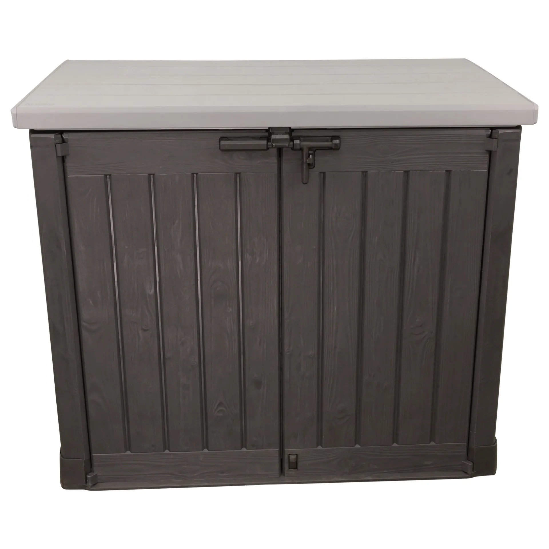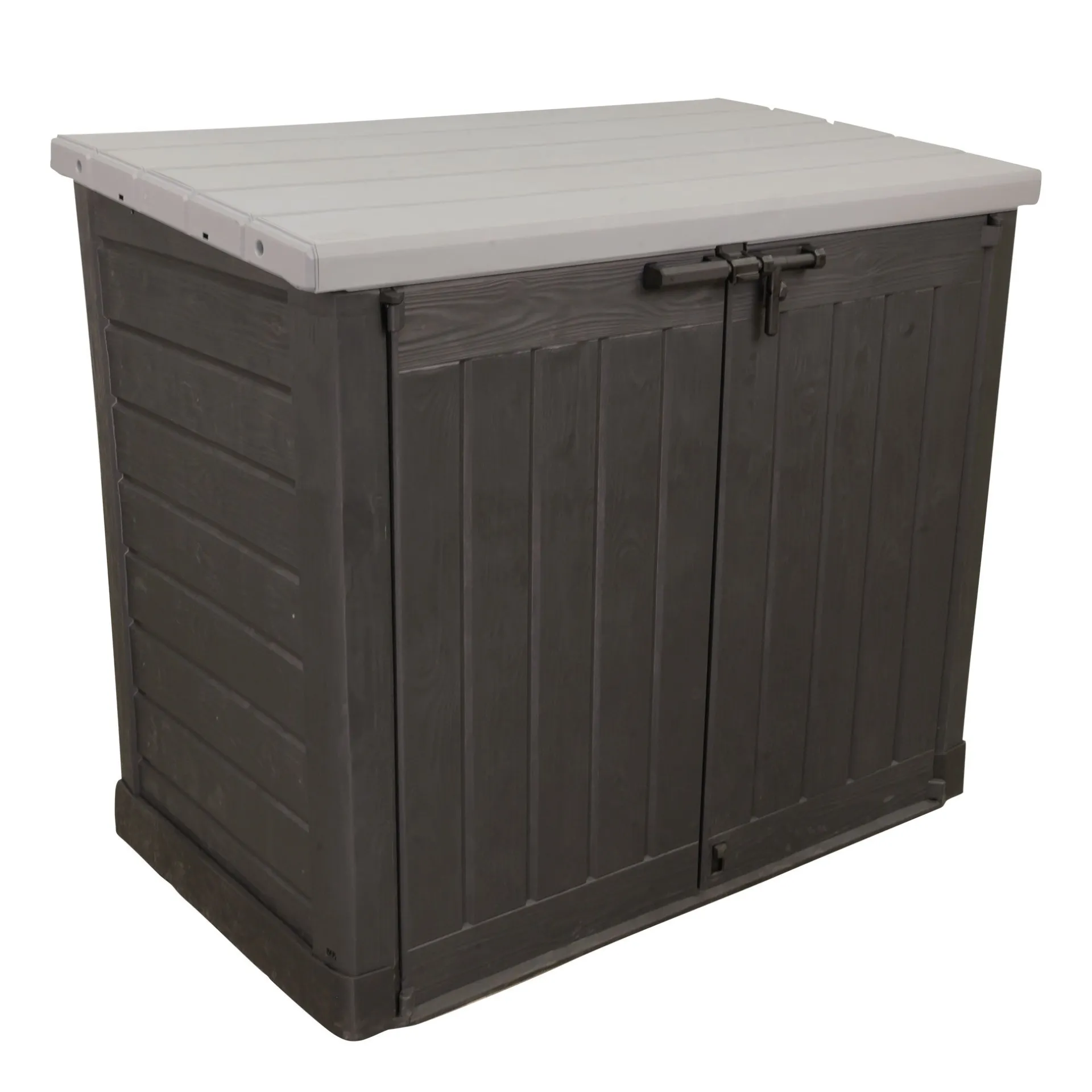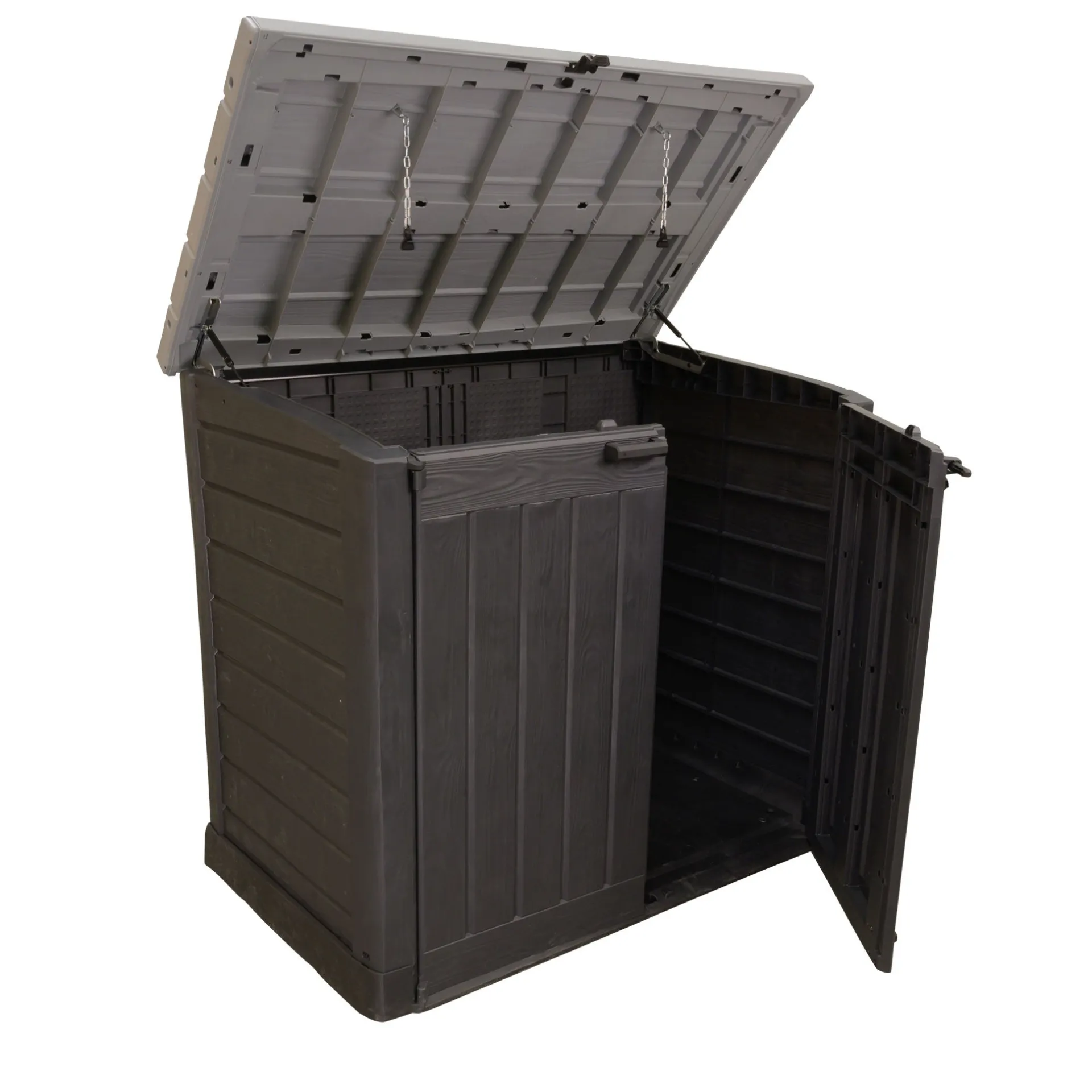 Het is een handige tuinbox voor het opbergen van containers, barbecuespullen of andere tuinaccessoires. De box is gemakkelijk te openen en te sluiten met twee openslaande deuren en een deksel voorzien van handige gasveren. Ook zitten er aan de binnenkant van de deksel twee haken die aan de deksel van de container kunnen worden bevestigd. Hierdoor wordt het deksel van de container onmiddellijk geopend.