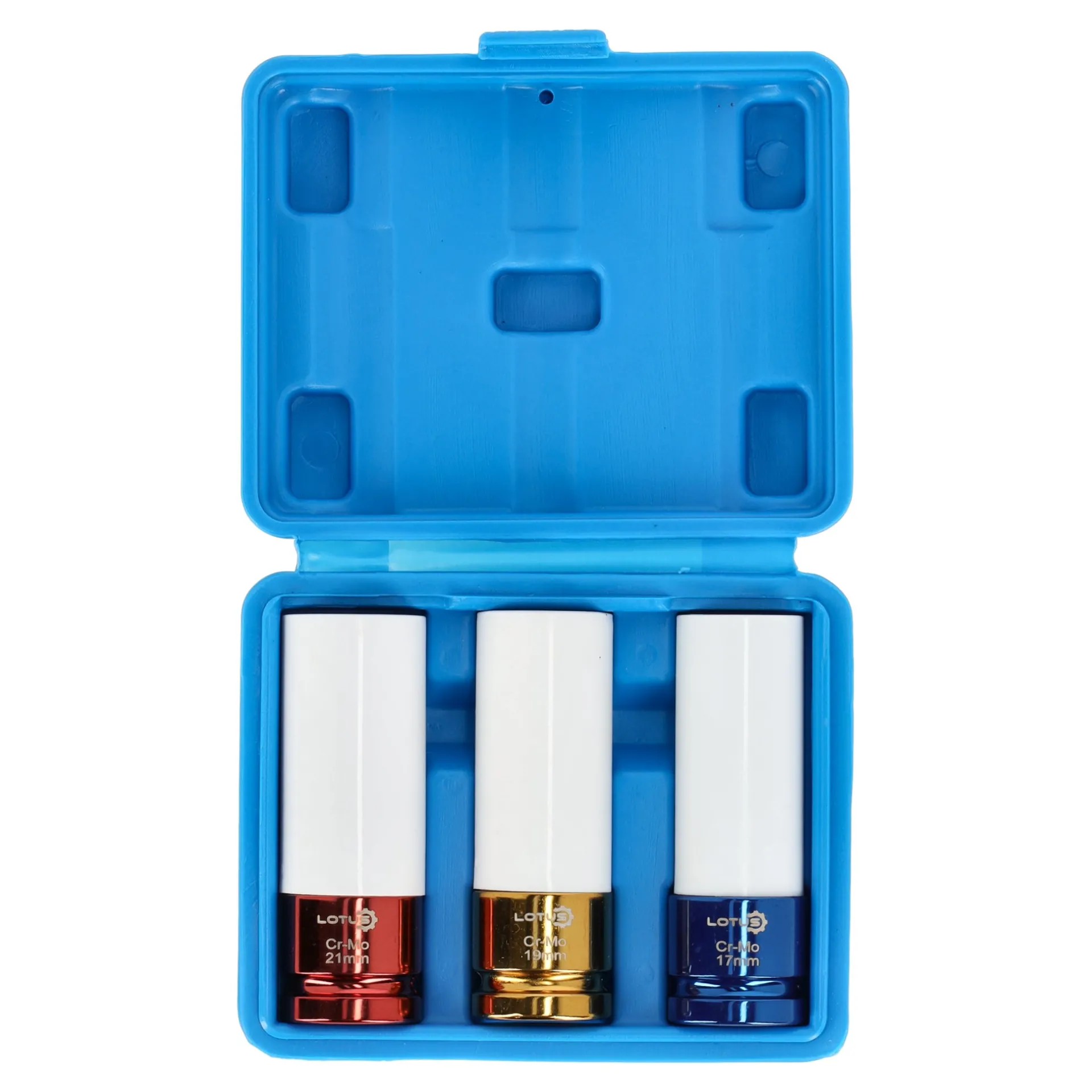 De Lotus slagdoppen-set bevat doppen van 17 mm, 19 mm en 21 mm.De doppen hebben een beschermhuls om velgen niet te beschadigen tijdens het los- en vastdraaien van wielbouten. Geleverd in een handige koffer voor opslag en transport.