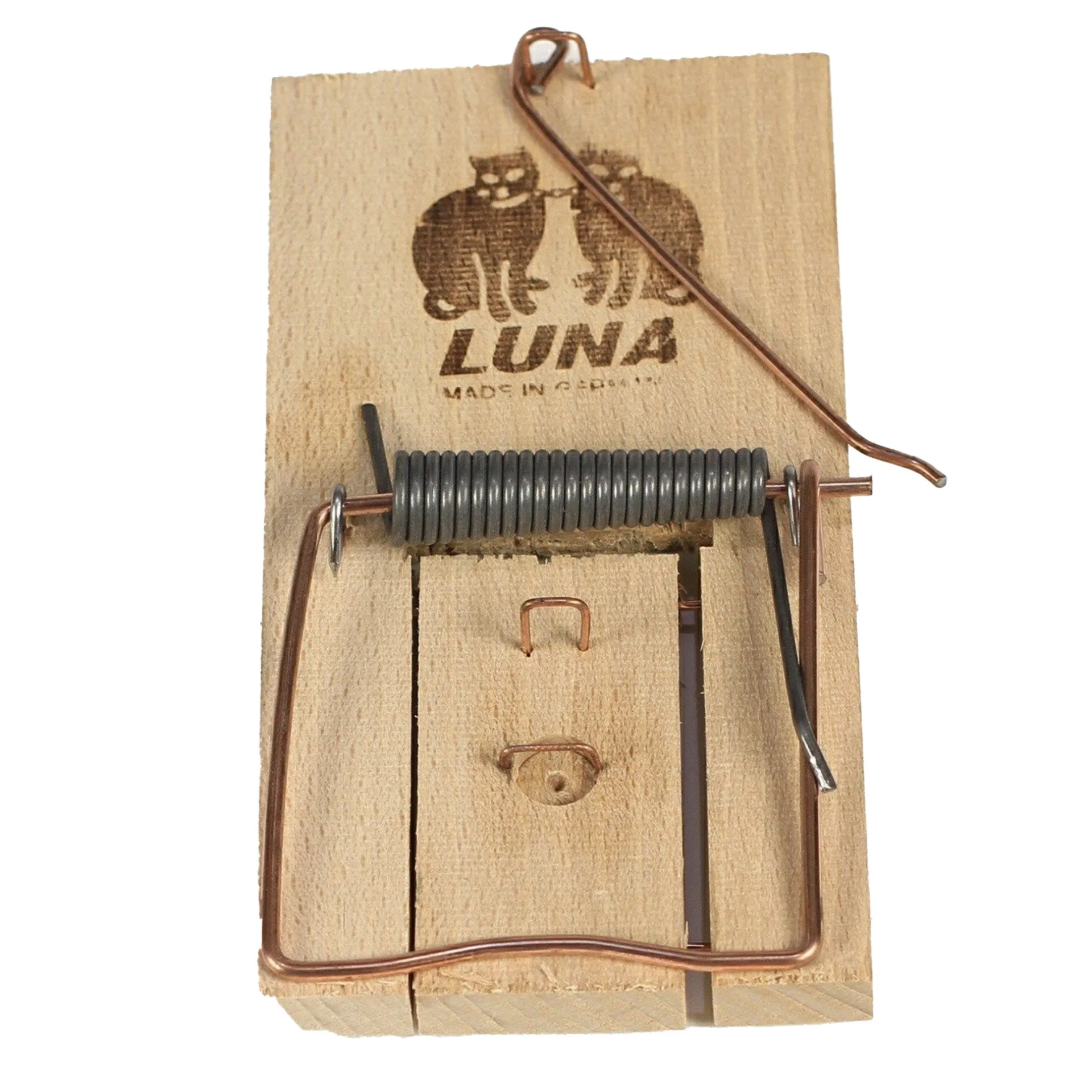 Houten rattenval met metalen beugel. Eenvoudig in gebruik en effectief voor het vangen van ratten in huis of schuur.
