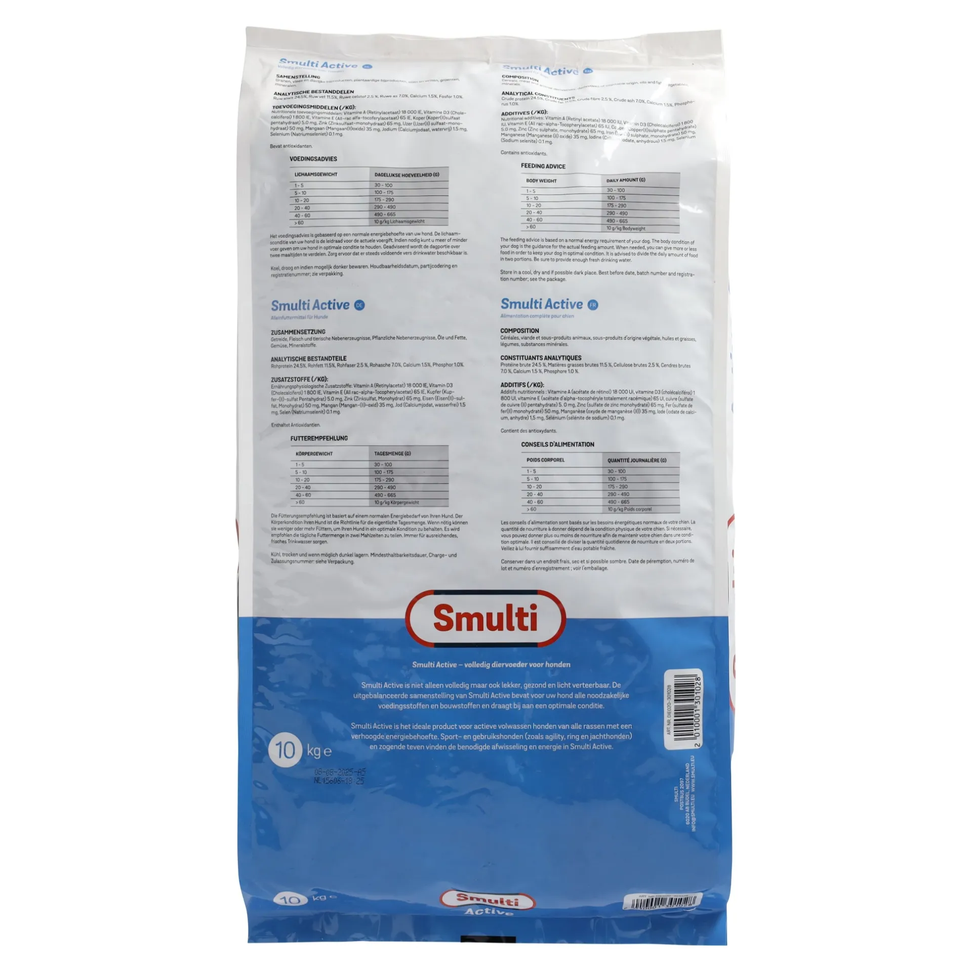 Smulti Active is niet alleen volledig, maar ook smakelijk, gezond en goed verteerbaar. De uitgebalanceerde samenstelling van Smulti Active bevat alle noodzakelijke voedingsstoffen en bouwstoffen voor uw hond en draagt bij aan een goede conditie. Smulti Active is geschikt voor actieve volwassen honden van alle rassen met een verhoogde energiebehoefte. Sport- en gebruikshonden (zoals agility-, ring- en jachthonden) en zogende teven halen de benodigde energie uit Smulti Active.