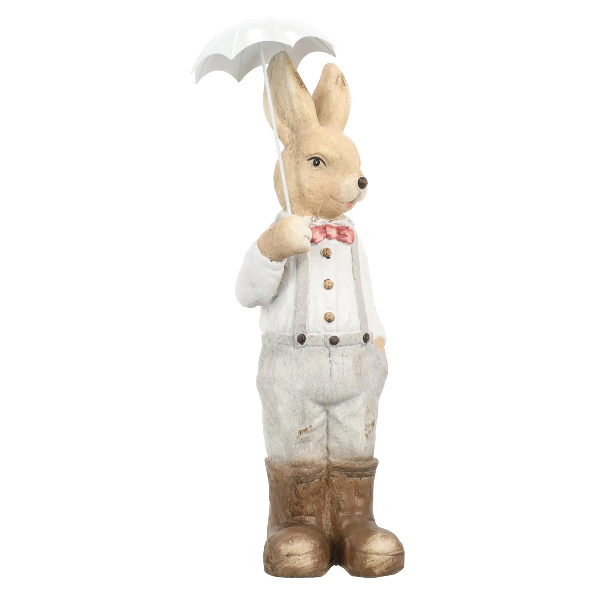 Dit decoratieve konijn met paraplu is een speels detail voor in huis of etalage. Het beeldje heeft een rustige uitstraling en is afgewerkt met subtiele details zoals de kleding en laarzen, waardoor het een leuke toevoeging is aan een seizoenstafel of decoratiehoek.