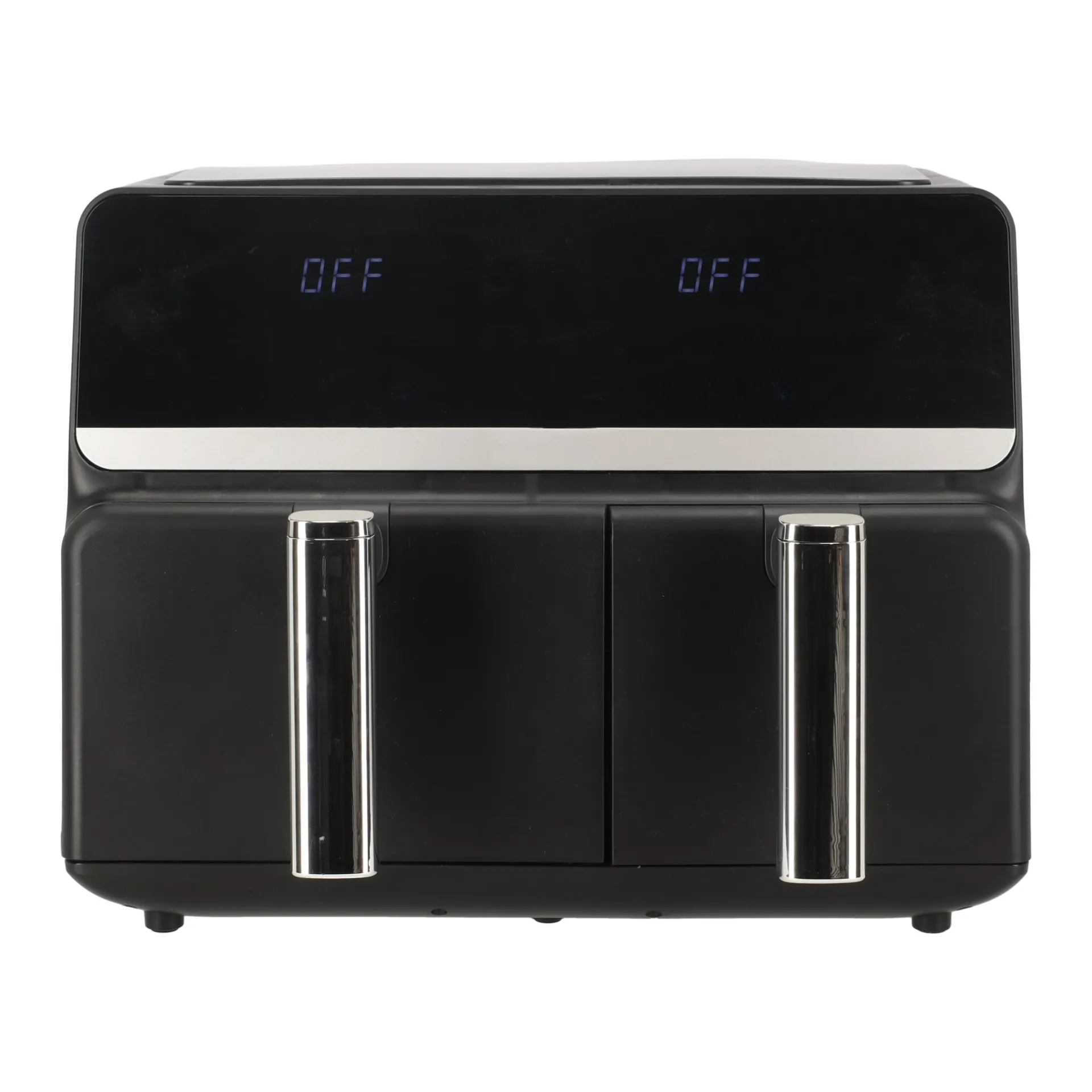 Een dubbele airfryer met een totale capaciteit van 9 liter, verdeeld over twee afzonderlijke manden van 5,5 liter en 3,5 liter. Het biedt de mogelijkheid om gelijktijdig verschillende gerechten te bereiden. Met het digitale bedieningspaneel stel je eenvoudig de temperatuur en tijd in voor beide manden, zodat je bijvoorbeeld frietjes en kipnuggets tegelijkertijd kunt bereiden zonder smaakoverdracht. De heteluchttechnologie zorgt voor krokante resultaten met minder olie, wat bijdraagt aan gezonder koken.