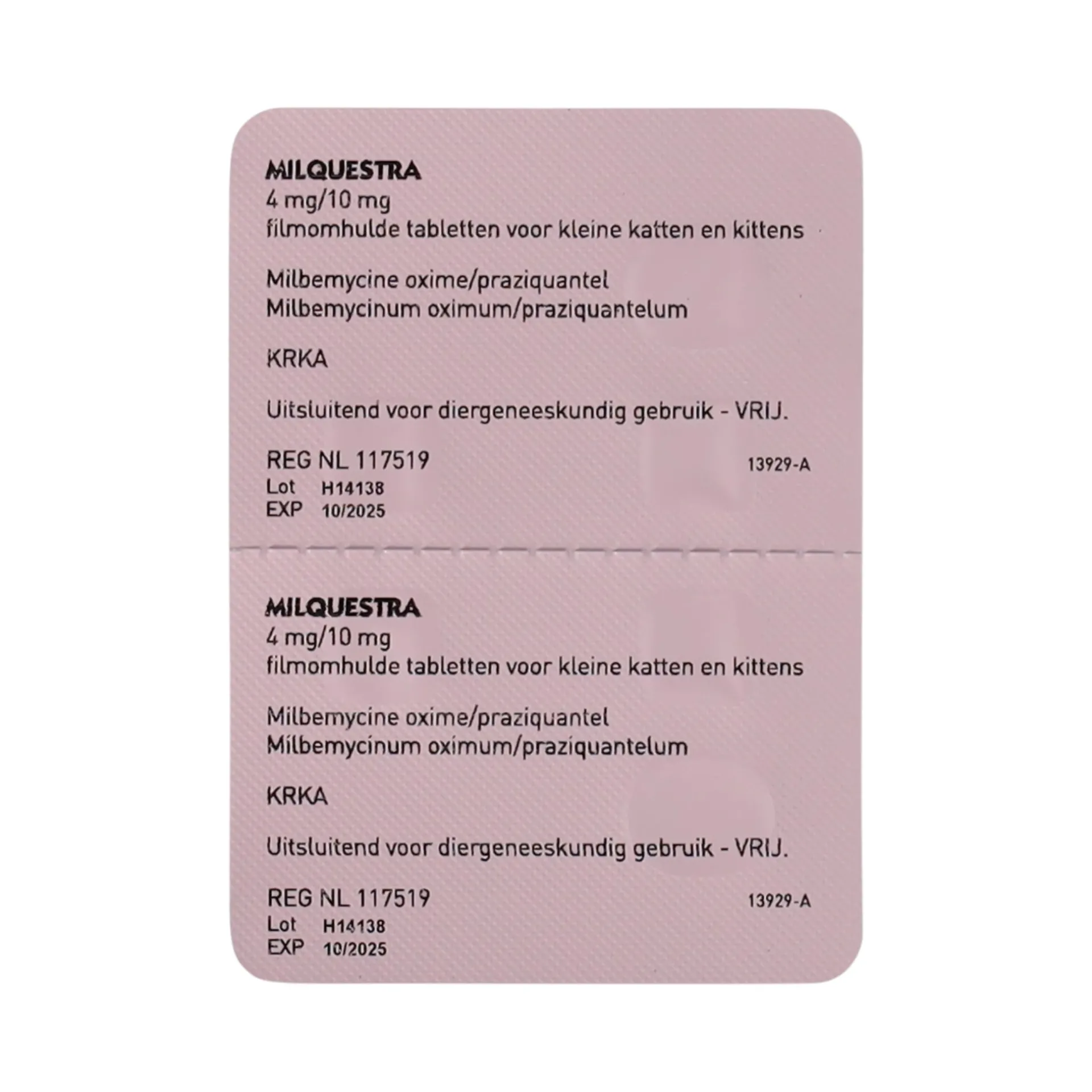 Milquestra wormtabletten kleine kat/kitten is een breedspectrum ontwormingsmiddel voor kleine katten en kittens tot 2kg op basis van Milbemycine oxime en Praziquantel. Werkzaam tegen: lintwormen, haakwormen, spoelwormen en preventief tegen hartwormziekte.
