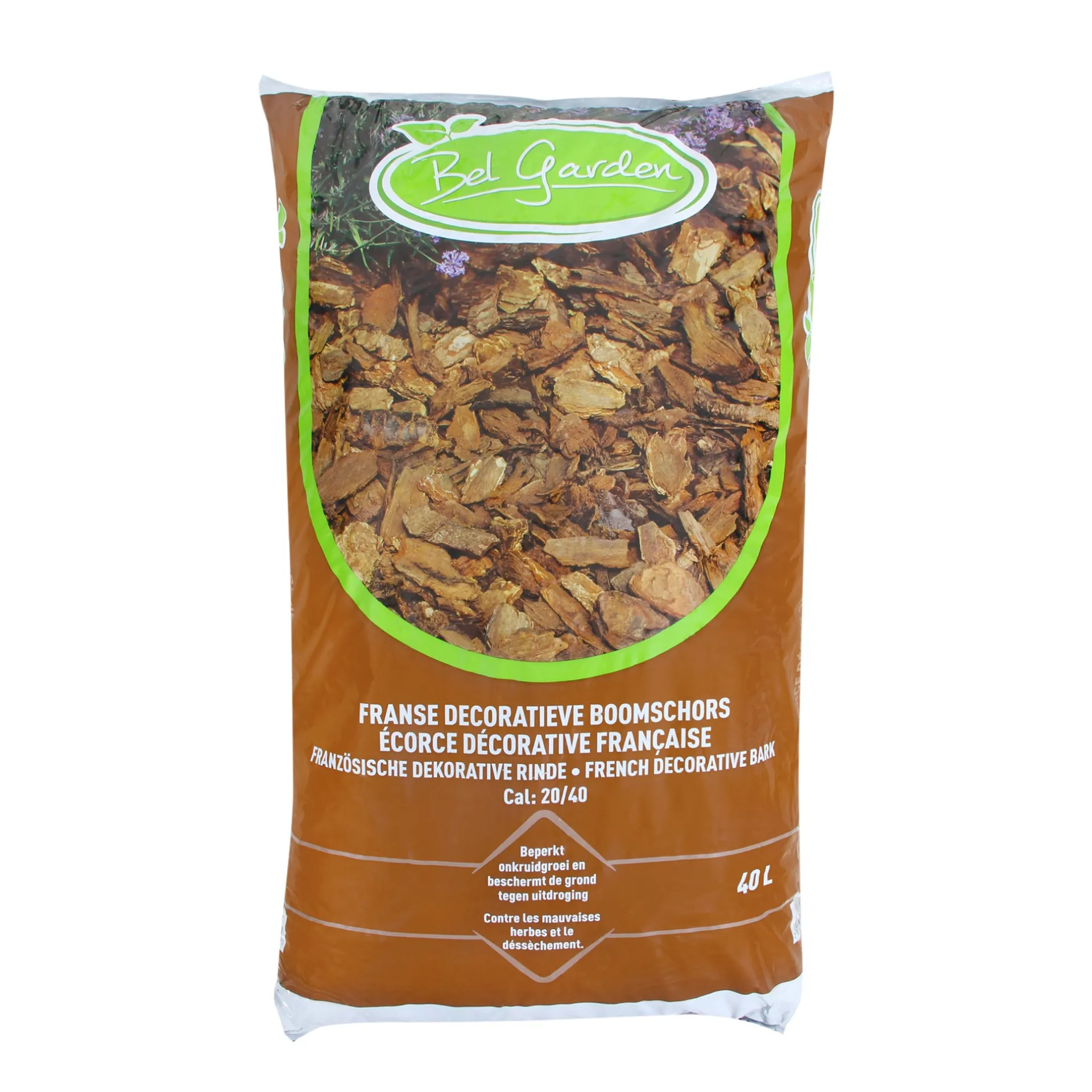 Bel Garden Franse sierschors is een natuurlijk mulchproduct gemaakt van 100% Franse schors. De lichtrode kleur geeft je tuin een decoratieve uitstraling. Met een formaat van 20-40 mm is het ideaal voor kleinere planten. Het beschermt de grond tegen uitdroging, temperatuurschommelingen en erosie, stimuleert micro-organismen en vermindert onkruidgroei. Geschikt voor alle grondsoorten en vrij van vezels.