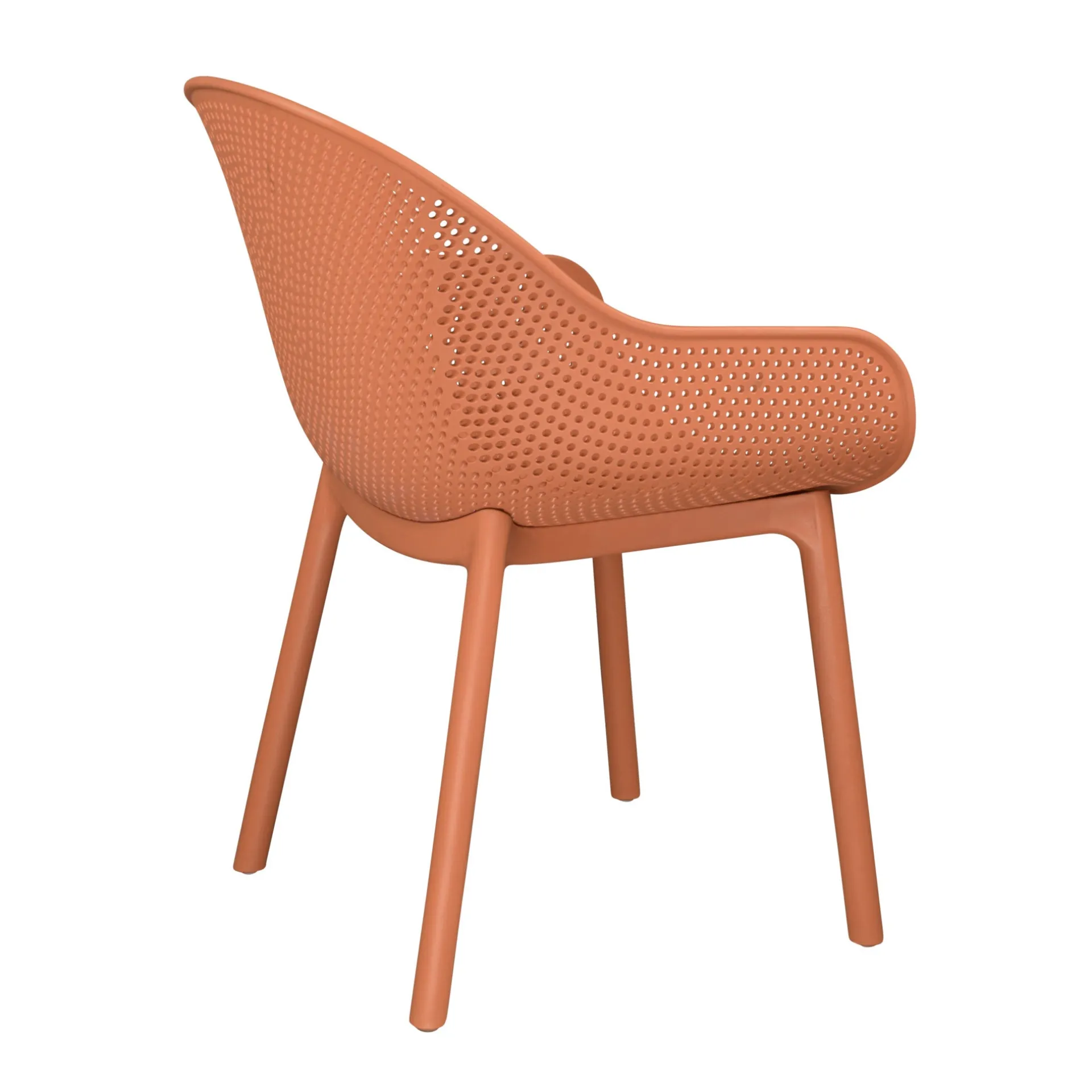 Deze stijlvolle stoel heeft een moderne uitstraling met een subtiel geperforeerd patroon, waardoor hij een luchtige en eigentijdse look krijgt. De comfortabele stoel biedt zowel stevigheid als een prettige zitervaring. De warme kleur voegt een speels accent toe aan elke ruimte, terwijl het materiaal zorgt voor duurzaamheid en eenvoudig onderhoud. Perfect voor zowel binnen als buiten gebruik.