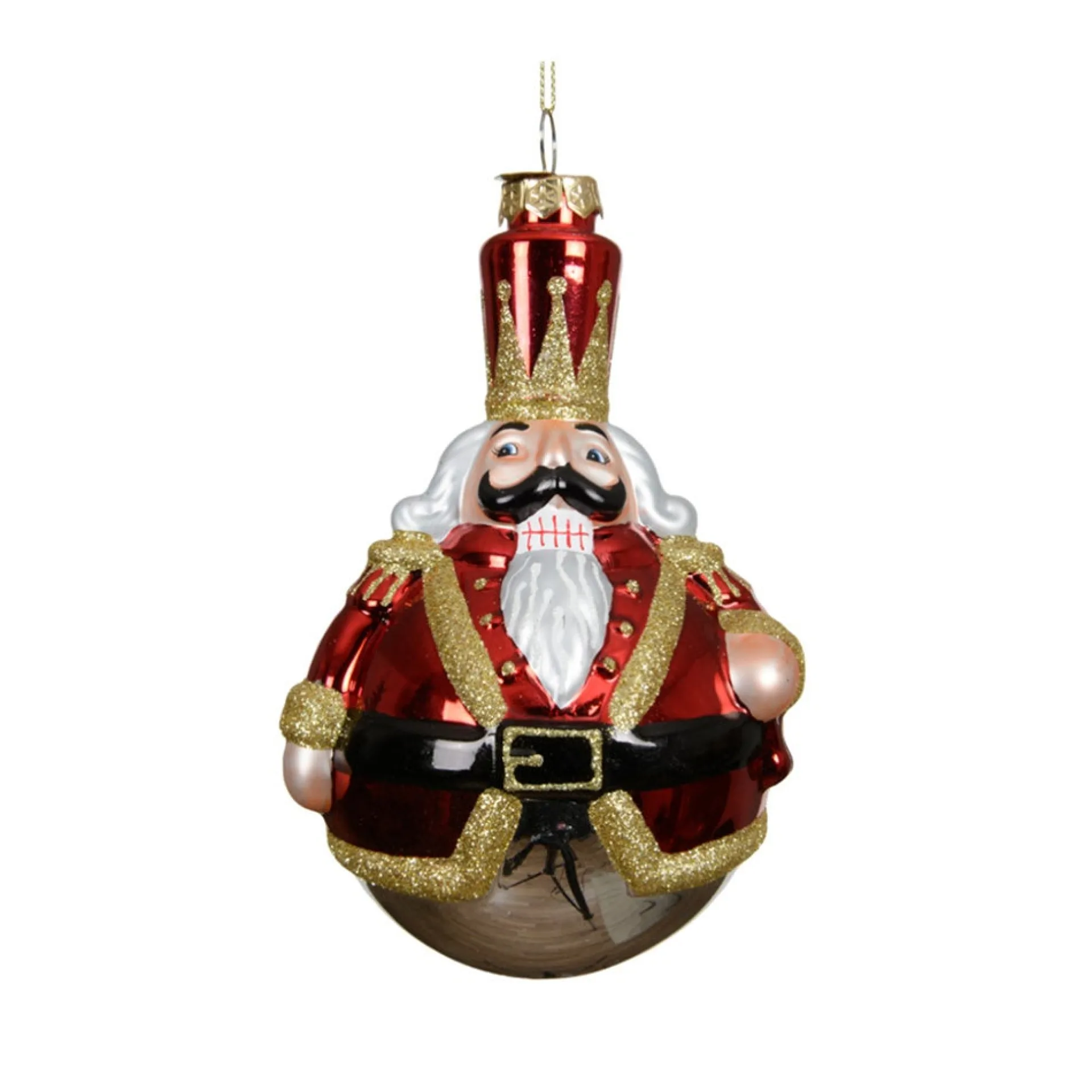 Glazen kersthanger in de vorm van een notenkraker, uitgevoerd in rood met gouden details. De hanger is 15 cm groot en afgewerkt met glitters voor een feestelijke uitstraling. Een klassiek en opvallend ornament voor in de kerstboom.