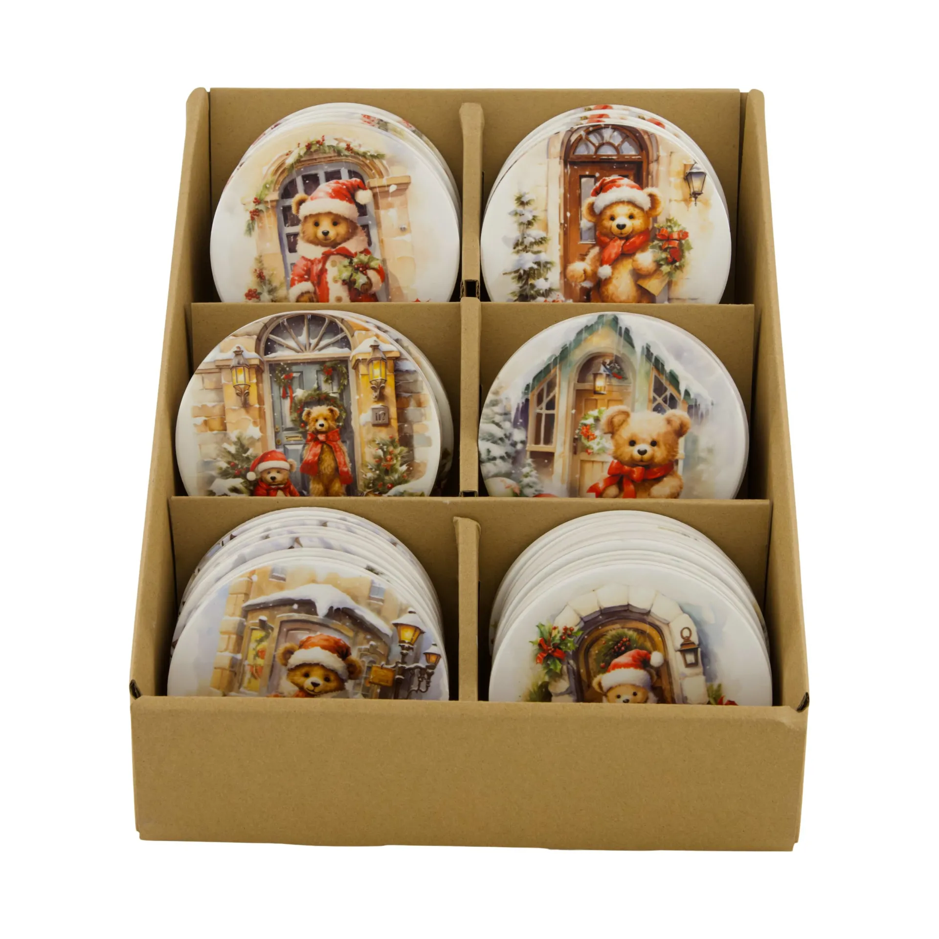 Ronde onderzetter met berenmotief in kerstsfeer, verkrijgbaar in zes verschillende uitvoeringen.