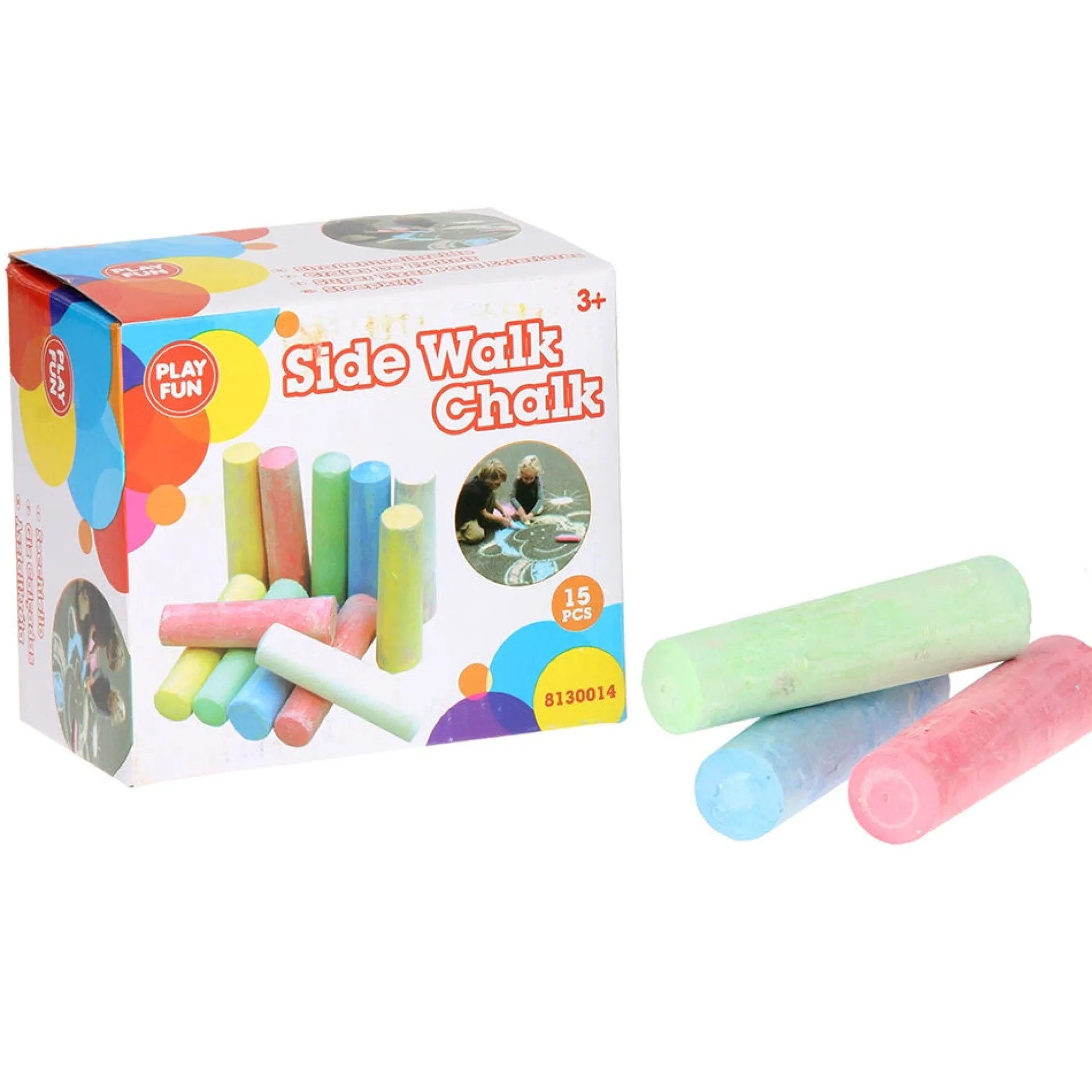Doos Play Fun stoepkrijt met 15 gekleurde krijtjes in verschillende tinten. Geschikt voor kinderen vanaf 3 jaar om vrolijke tekeningen te maken op de stoep of andere gladde ondergrond.