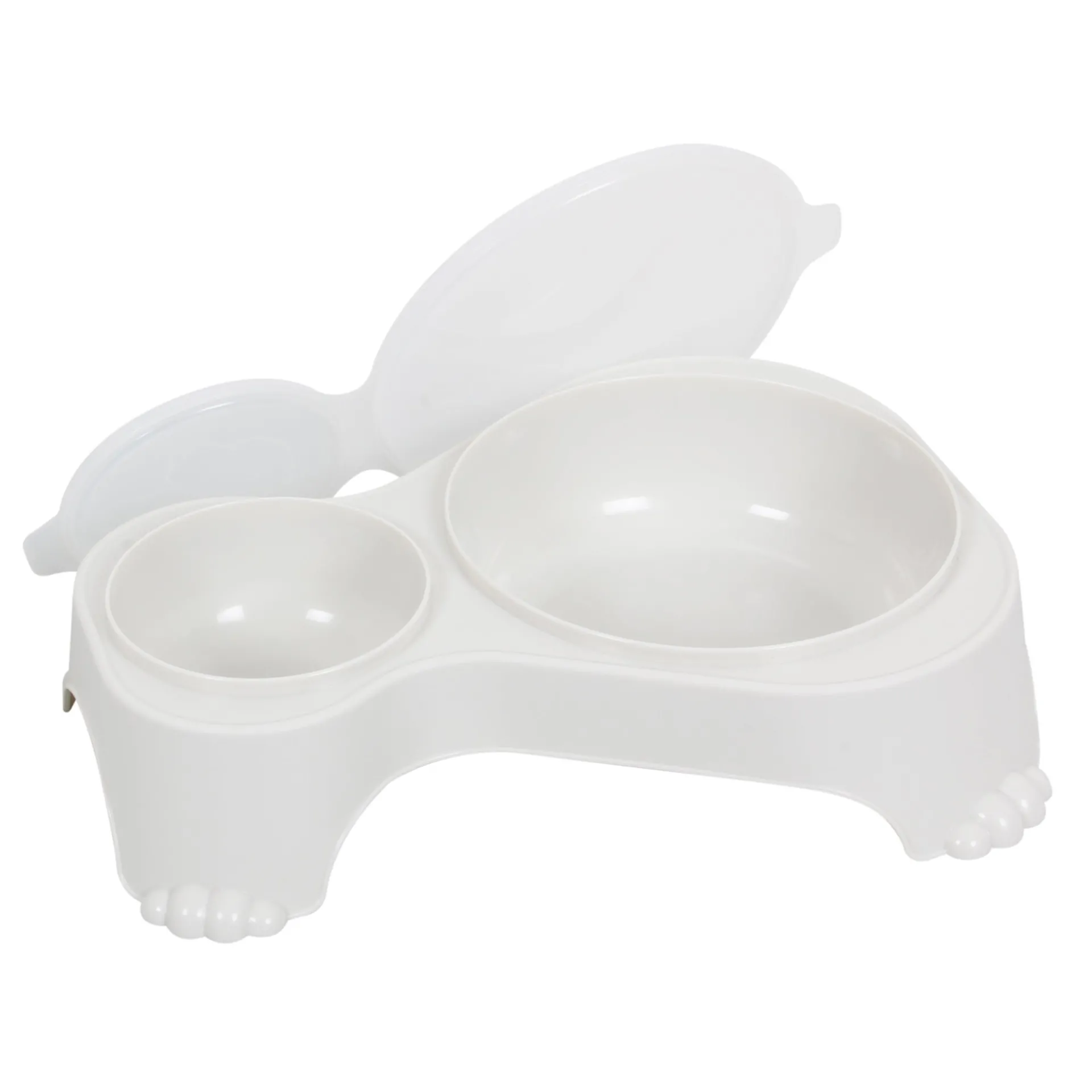 Voerbak met antislipvoetjes. Deze handige dubbele voerbak met deksel is geschikt voor het vervoeren van voer en water voor huisdieren, of voor het bewaren van overgebleven voer.