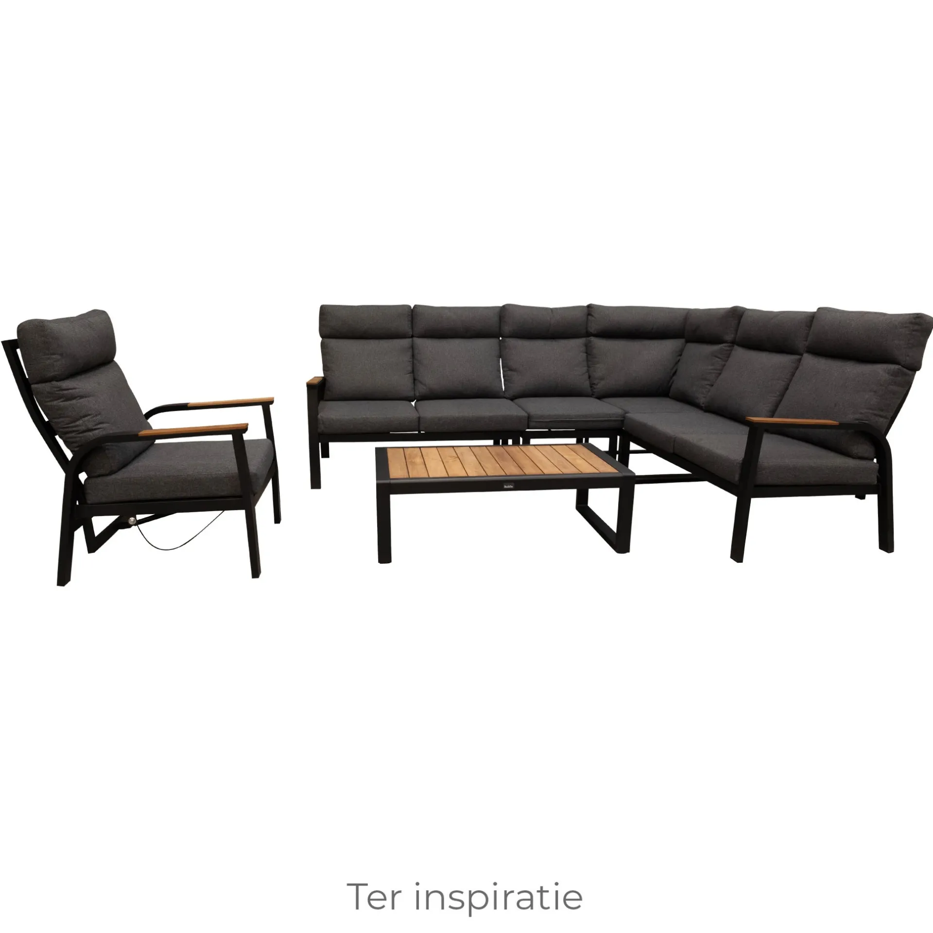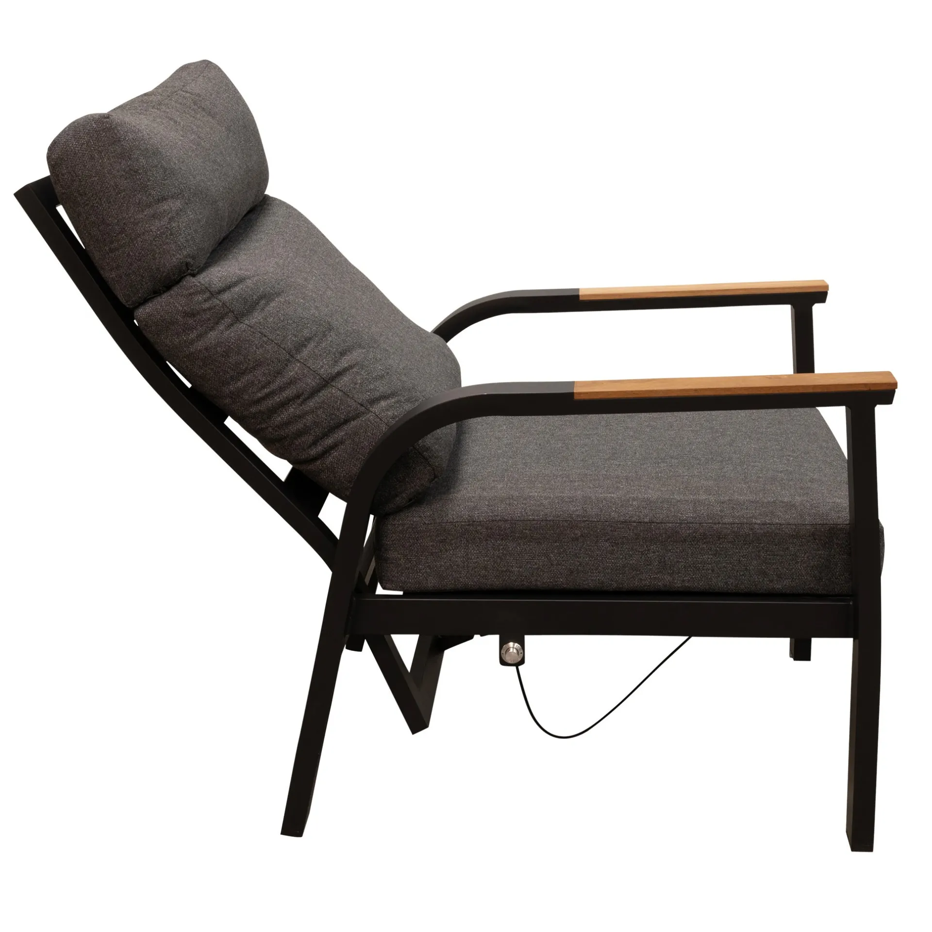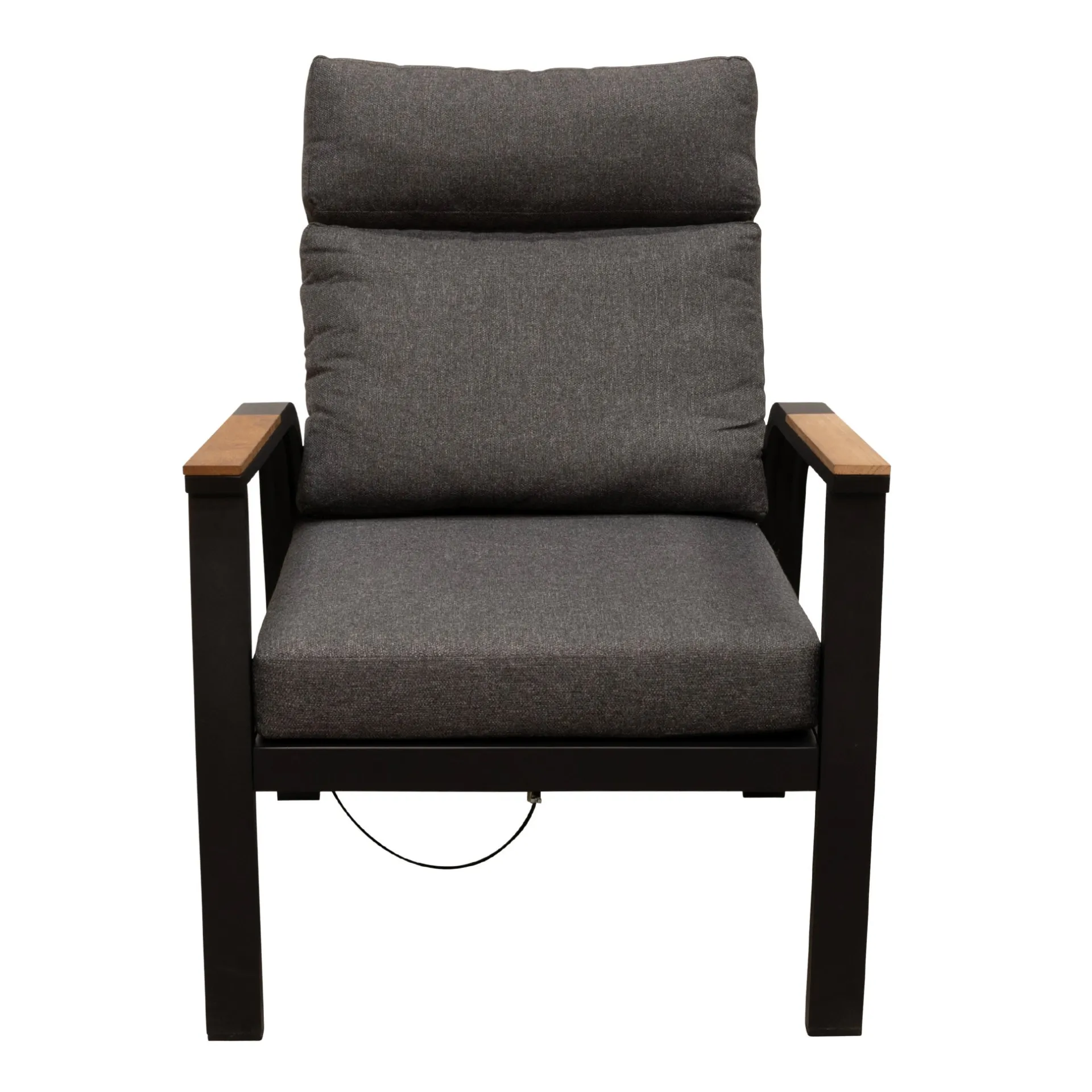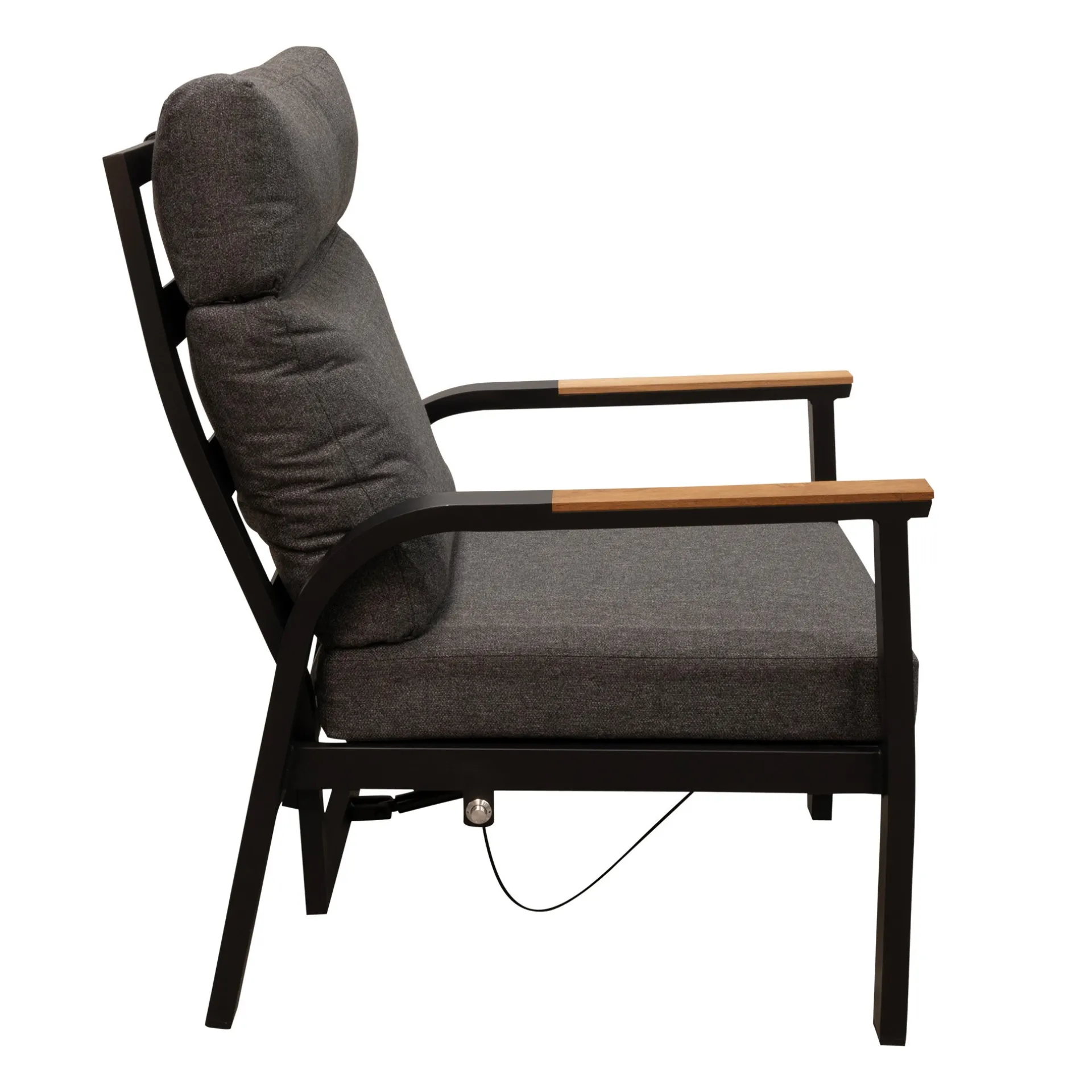 De stoel in zwart is een stijlvolle en comfortabele zitoplossing die zowel binnen als buiten goed tot zijn recht komt. Het aluminium frame kan niet roesten en zorgt voor een stevige basis. De teak accenten op de armleuningen geven de stoel een warme uitstraling. Dankzij het moderne, minimalistische ontwerp in antraciet past de stoel perfect bij diverse interieur- en tuinontwerpen.