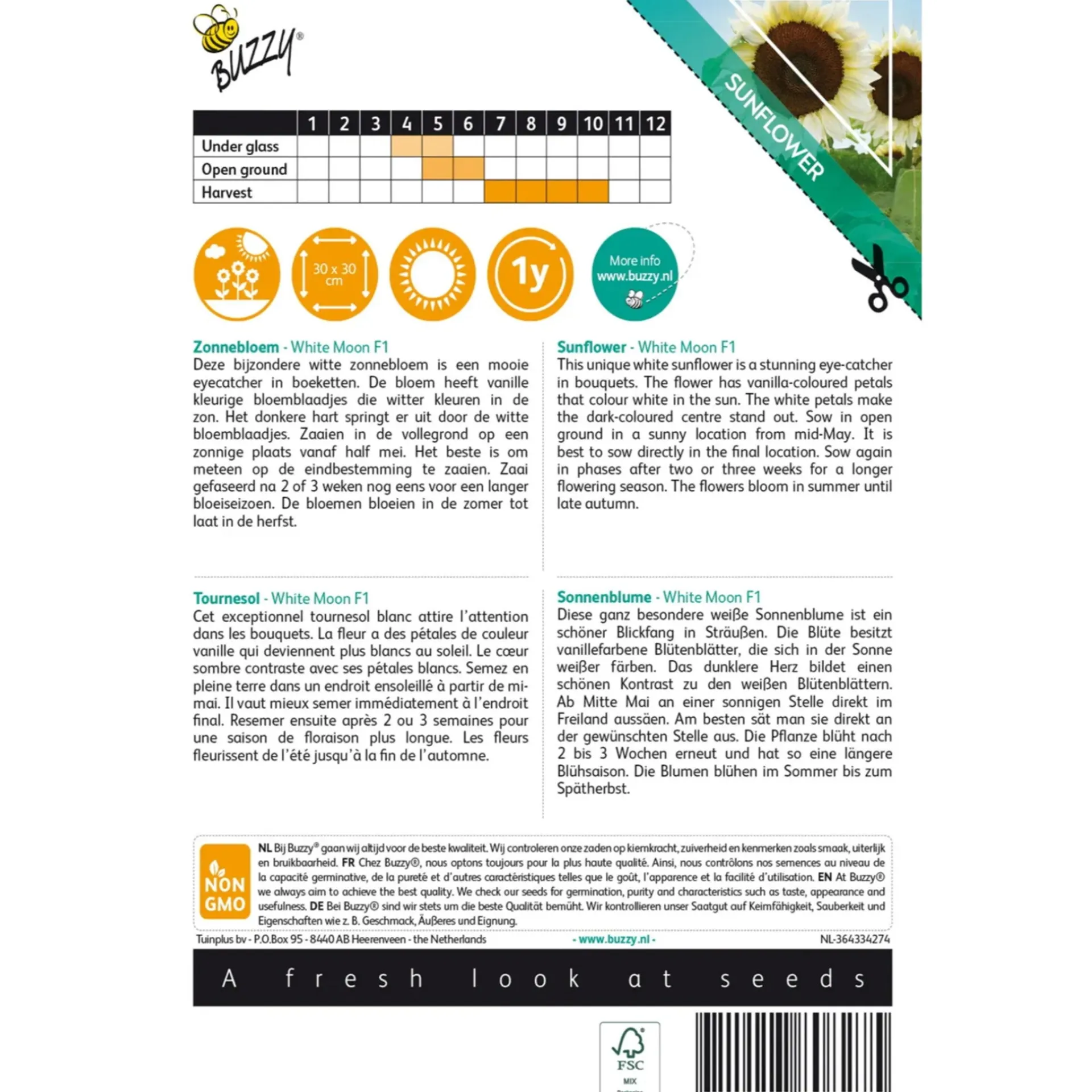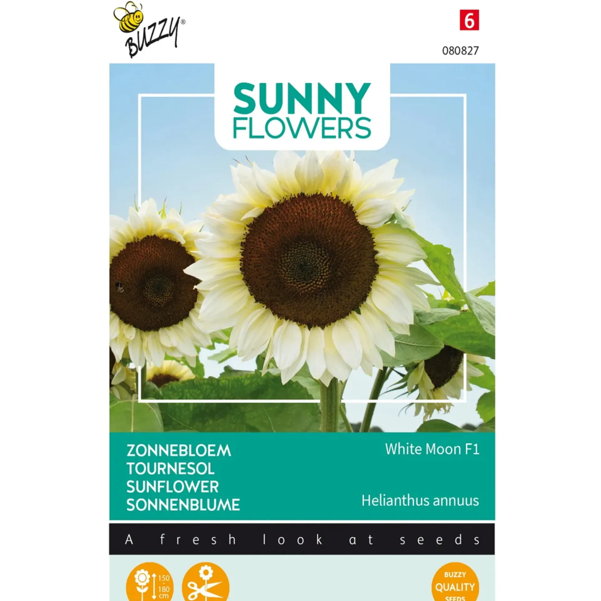 Unieke zonnebloem met crèmewitte bloemblaadjes en een donker centrum. Middelhoge plant, ideaal voor borders, boeketten en het aantrekken van bijen. Zorgt voor een elegant contrast in de zomertuin.