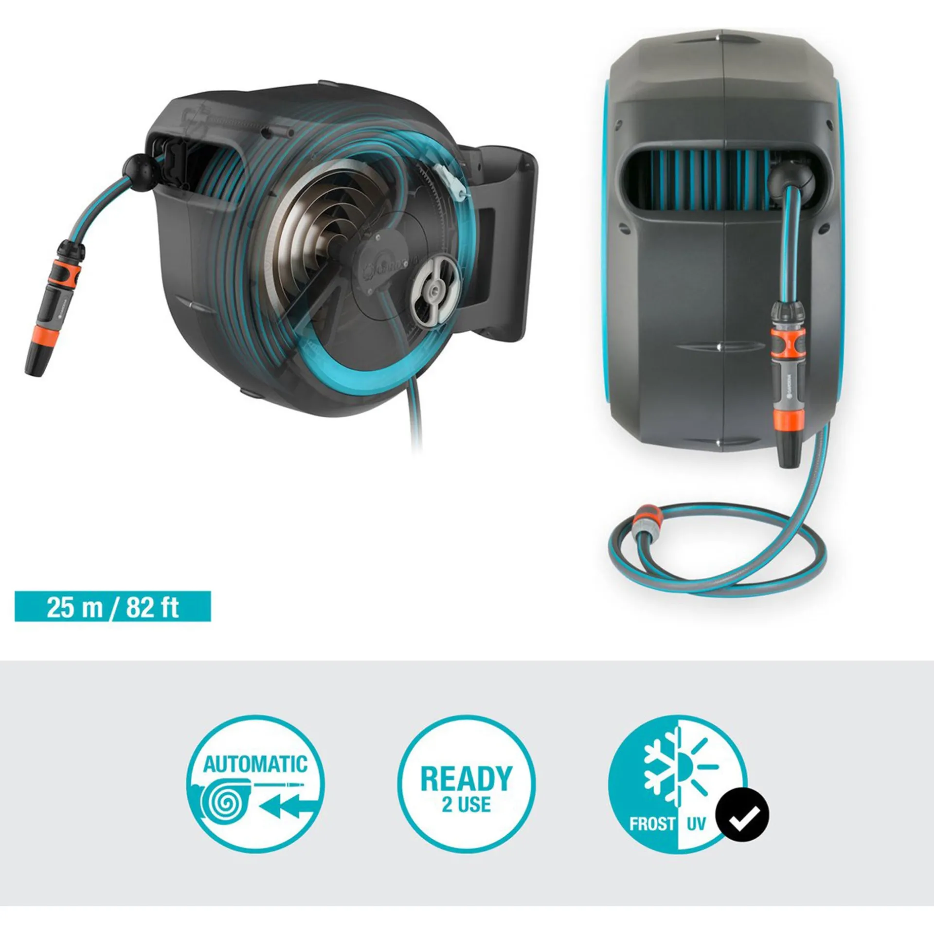 De Gardena Wandslangenbox RollUp M/L 25 m maakt tuinbewatering gemakkelijk. De slang rolt automatisch op, blijft netjes en raakt niet in de knoop. De 25 meter lange slang kan tot de gewenste lengte worden uitgerold en blijft vast door de vergrendelingspunten. De slangenhouder draait 180 graden met de muurbeugel, zodat hij je bewegingen in de tuin volgt.