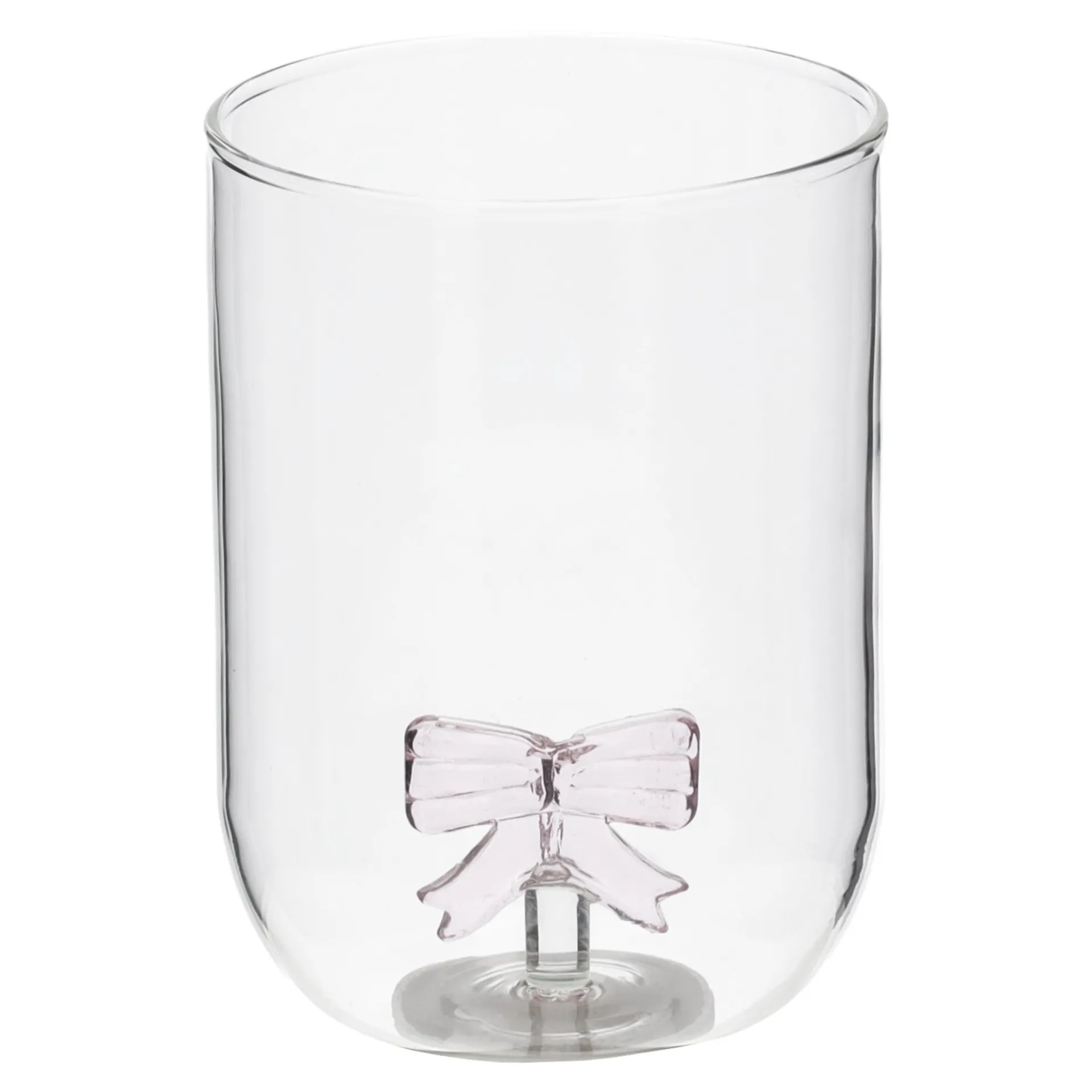 Decoratief glas met transparante wand en een roze glazen strik aan de binnenzijde, hoogte 11 cm.