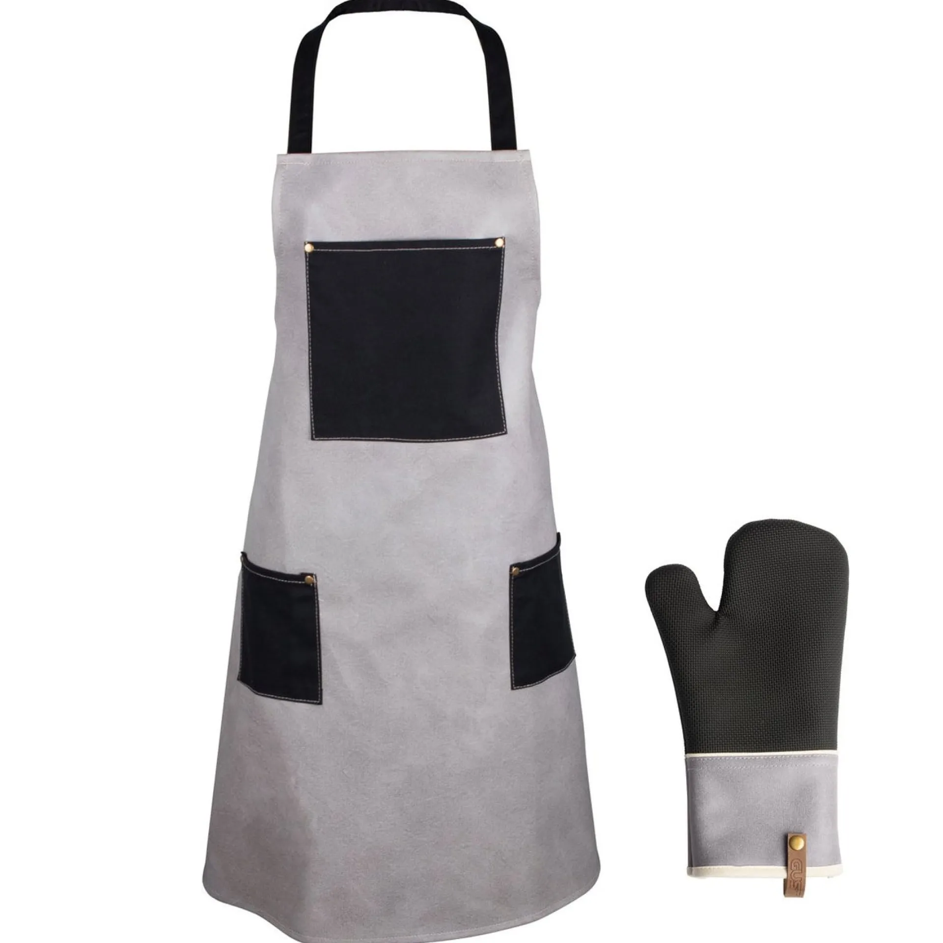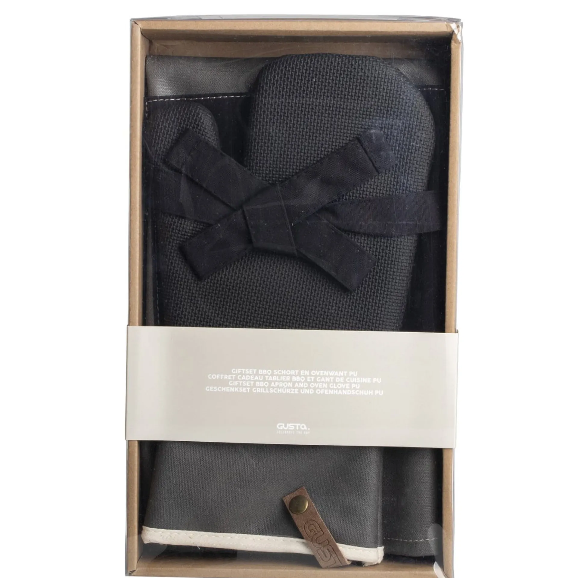 Deze stijlvolle verpakking bevat een schort en een handschoen van PU materiaal.