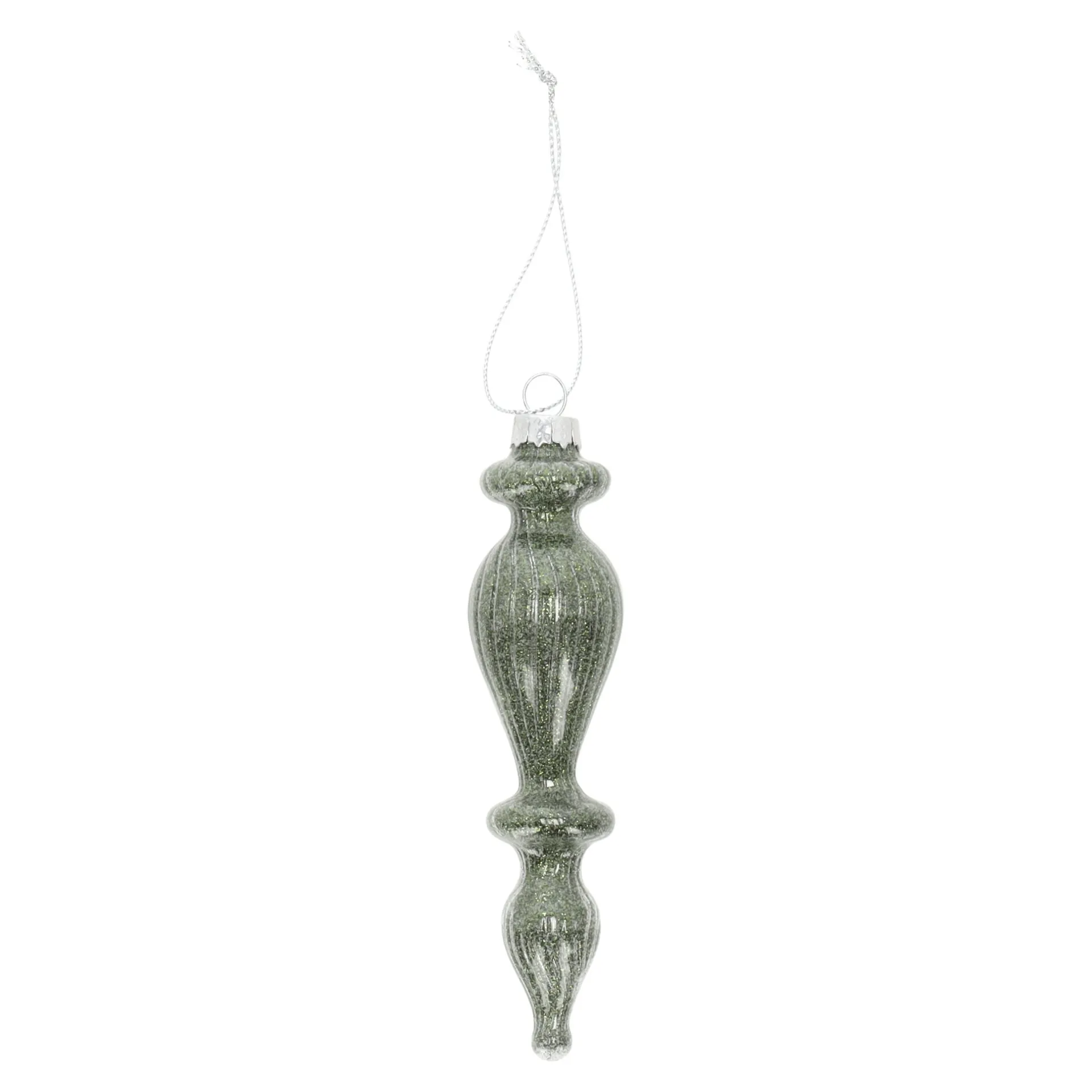 Glazen pegelhanger in groen, 13 cm hoog, met een elegant, smal silhouet. Mooi als subtiele eyecatcher aan de kerstboom of in een andere hangende decoratie.